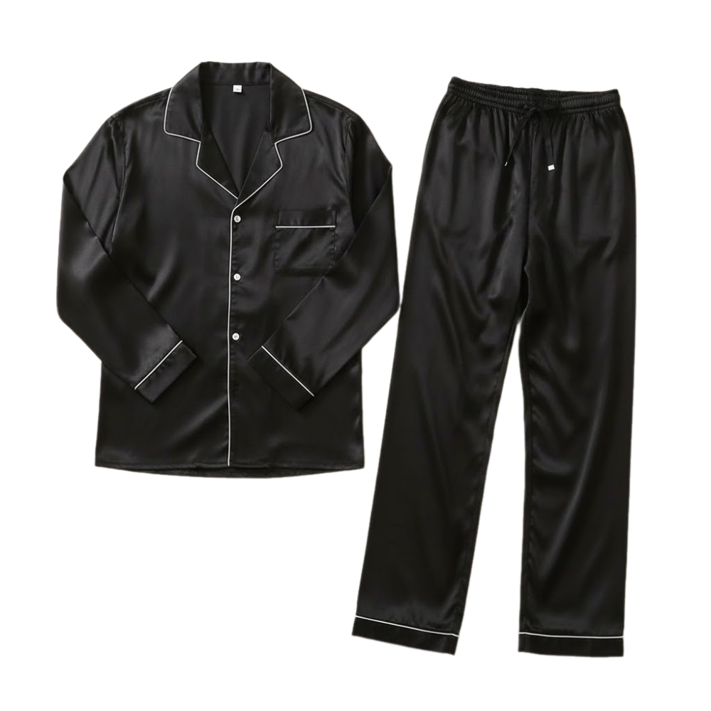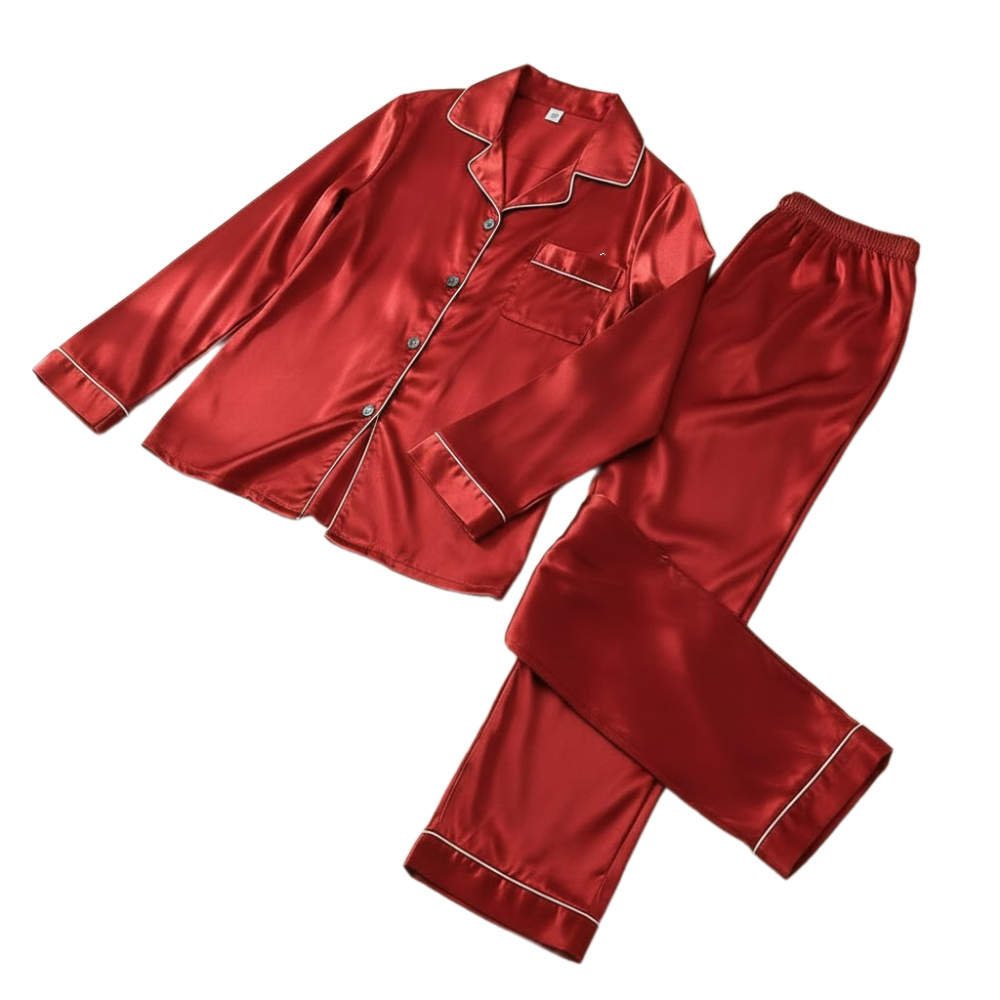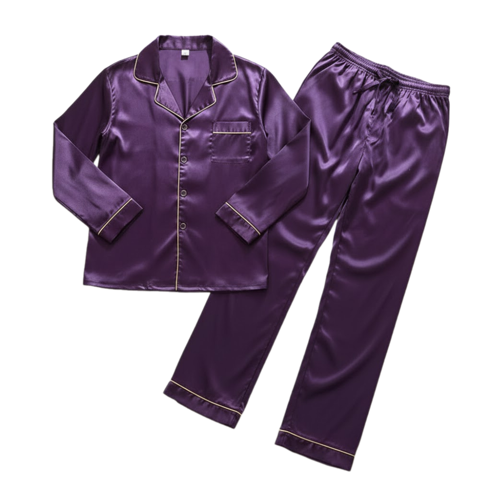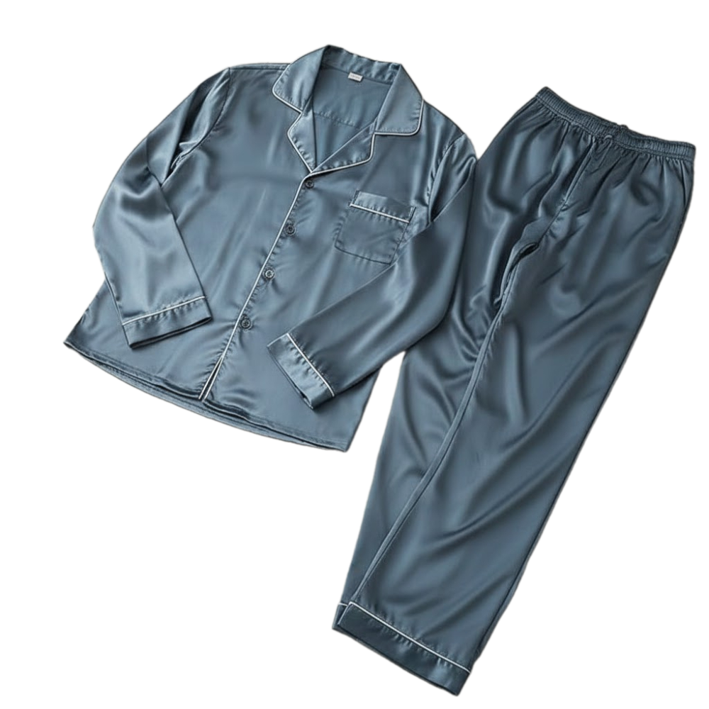ملابس نوم مكونة من قطعتين مريحتين. تمتاز هذه المجموعة بقماش ذي ملمس ناعم ولامع. القطعتان هما سترة علوية وسروال طويل يتناسقان معًا. تتميز هذه الملابس بتصميم كلاسيكي بسيط يهدف للراحة والاسترخاء.