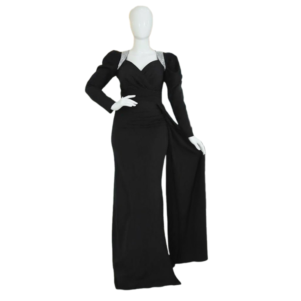 فستان سهرة نسائي رسمي، مصمم للمناسبات الراقية ويتسم بالأناقة الجذابة. يتميز التصميم بخطوط انسيابية ومحددة تبرز القوام، مع تفصيل مميز عند منطقة الكتفين يضيف لمسة من البريق. الجزء السفلي يتضمن طبقة أو ذيلًا جانبيًا يضفي حركة درامية وفاخرة على الإطلالة. يعكس الفستان فخامة كلاسيكية تناسب السجادة الحمراء أو الحفلات الكبرى.