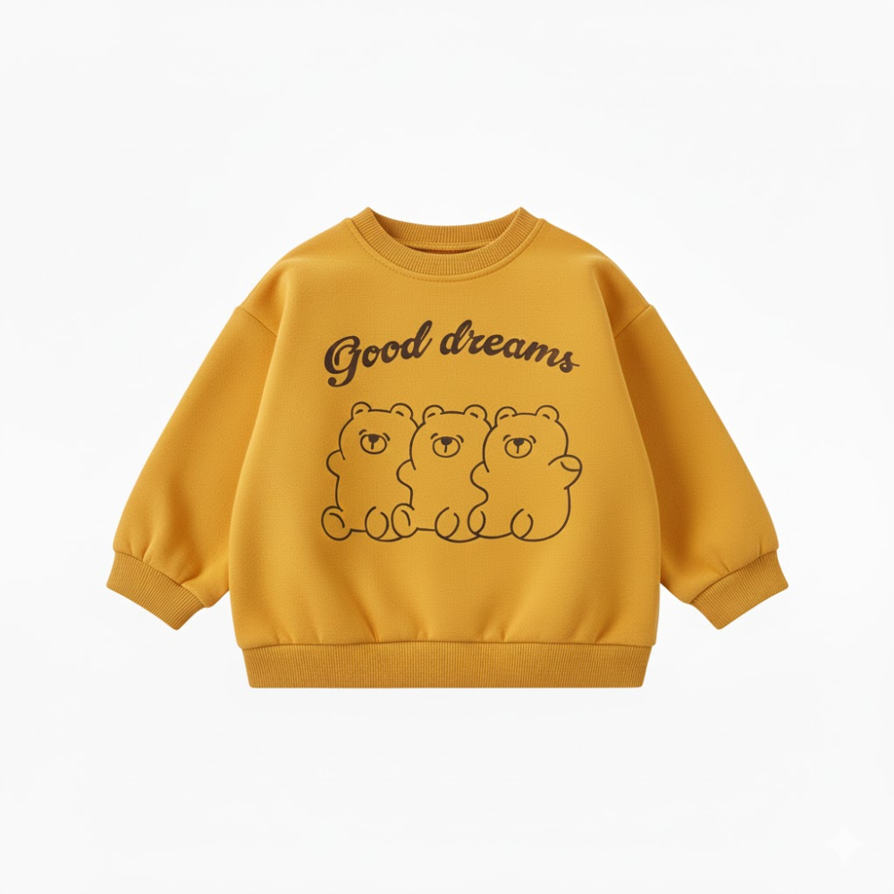 نسيج متين ومقاوم للغسيل المتكرر، مما يضمن ثبات اللون والشكل وملمسه لطيف على البشرة، مما يجعله الخيار الأول للارتداء اليومي ويتميز بياقة مستديرة وحافة سفلية عريضة مصنوعة من نسيج مضلع متماسك، مما يحافظ على شكل البلوفر ويمنع تسرب الهواء البارد وتكتمل الطبعة برسم لثلاثة دببة صغيرة مرسومة بأسلوب "السكيتش" البسيط والمحبب، مما يضيف طابعاً طفولياً جذاباً ومرحاً