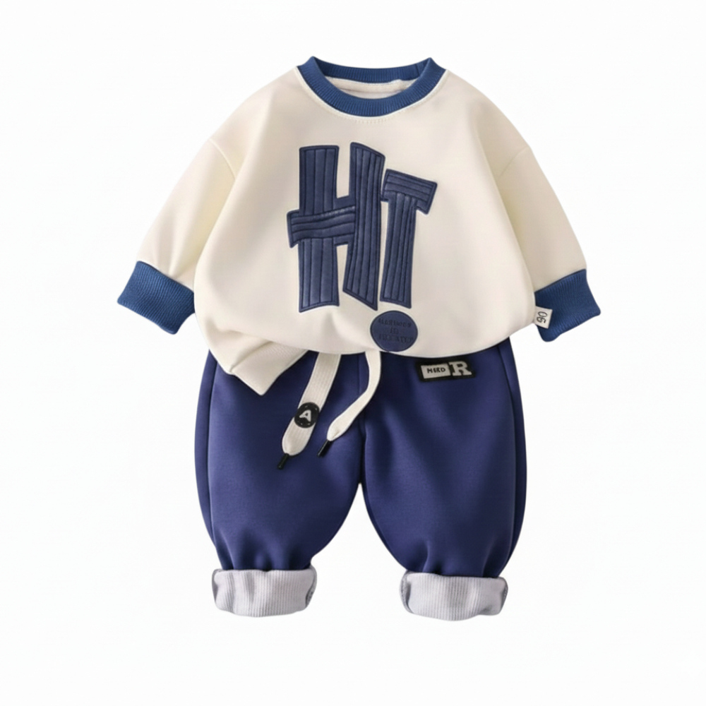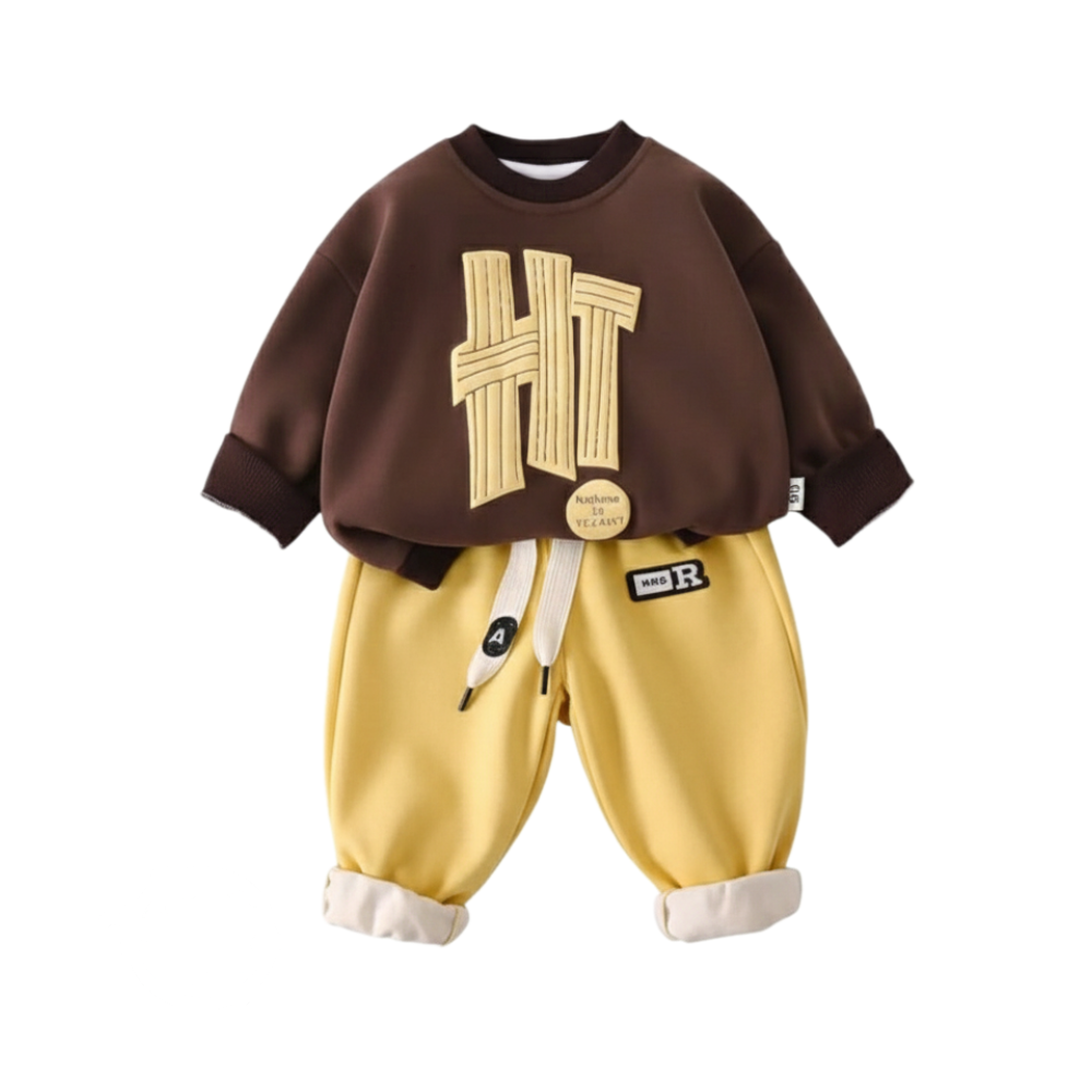 طقم متكامل يتألف من قطعتين شتويتين مريحتين. البلوفر ويتميز بتطريز "HT" البارز أما البنطال، ف يأتي بقصة مريحة مع أساور سفلية مطوية بلون مغاير وهذا الطقم يوفر الدفء والستايل العصري والجريء ومناسب للمواسم الباردة ويتميز هذا الطقم بتناغم لوني يجمع بين الأناقة والدفء، مما يخلق إطلالة لافتة للنظر لطفلك