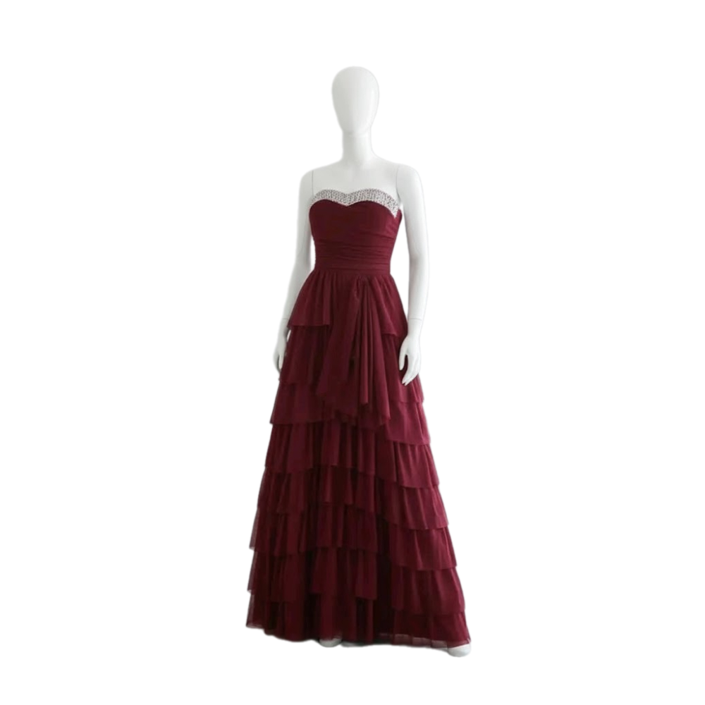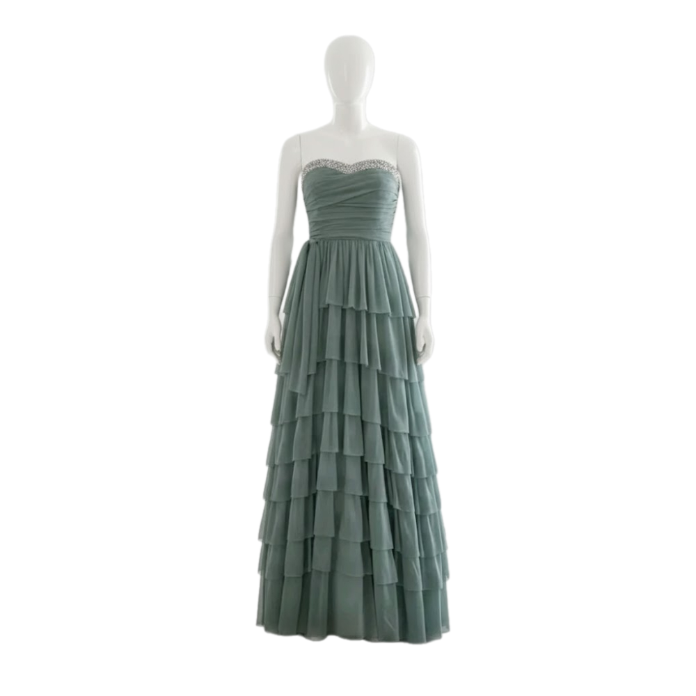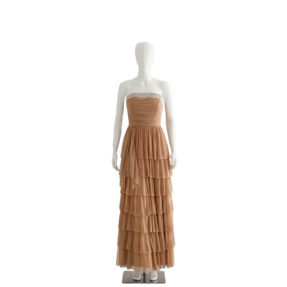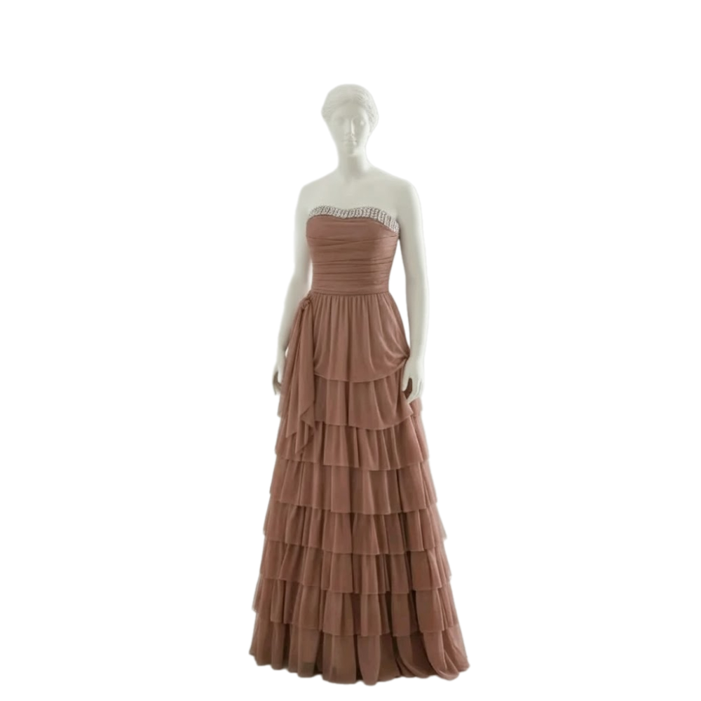 فستان بطبقات متتالية وكثيفة من الكشكشة كلاسيكية وأنيقة مناسبة للمناسبات الرسمية مثل حفلات الزفاف أو السهرات الكبيرة. يجمع بين الأنوثة والرومانسية بفضل اللون الهادئ والطبقات المنسدلة، مع لمسة فاخرة من الترتر عند خط العنق.