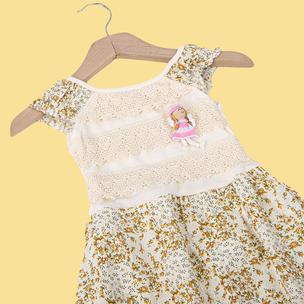 فستان بناتي انيق بأكمام قصيرة وقصة رقبة دائرية ودمية صغيرة في الصدر ويزينة من الخصر حزام و تنورة واسعه متوسطة الطول