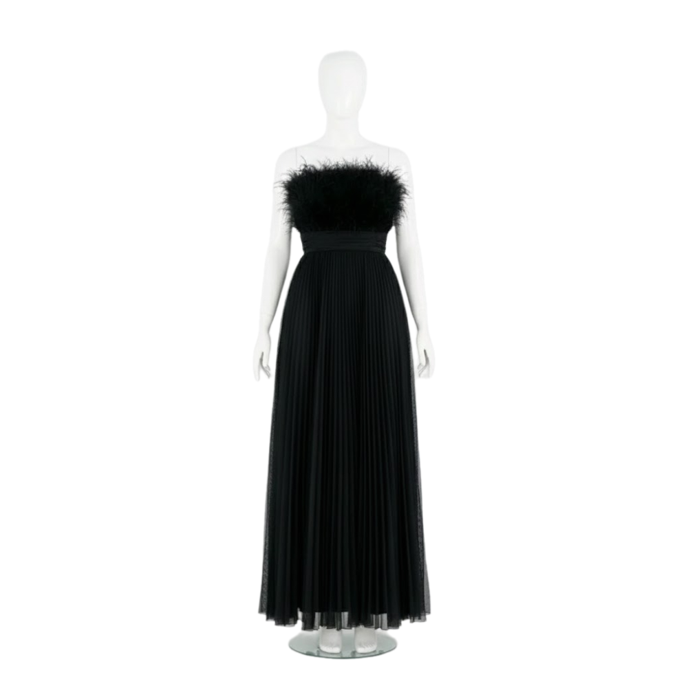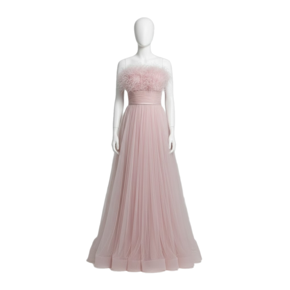 فستان فاخر بتصميم راقٍ يجمع بين الأناقة والأنوثة، يتميّز بتفاصيل الريش في الجزء العلوي التي تضيف لمسة فنية فاخرة وجاذبية ناعمة. قصته الطويلة والواسعة تمنح مظهرًا ملكيًا راقيًا مع إحساس بالاحتشام المدروس، ما يجعله خيارًا مثاليًا للمناسبات الراقية والاحتفالات المميّزة، لمن تبحث عن إطلالة لافتة بأناقة غير مبالغ فيها