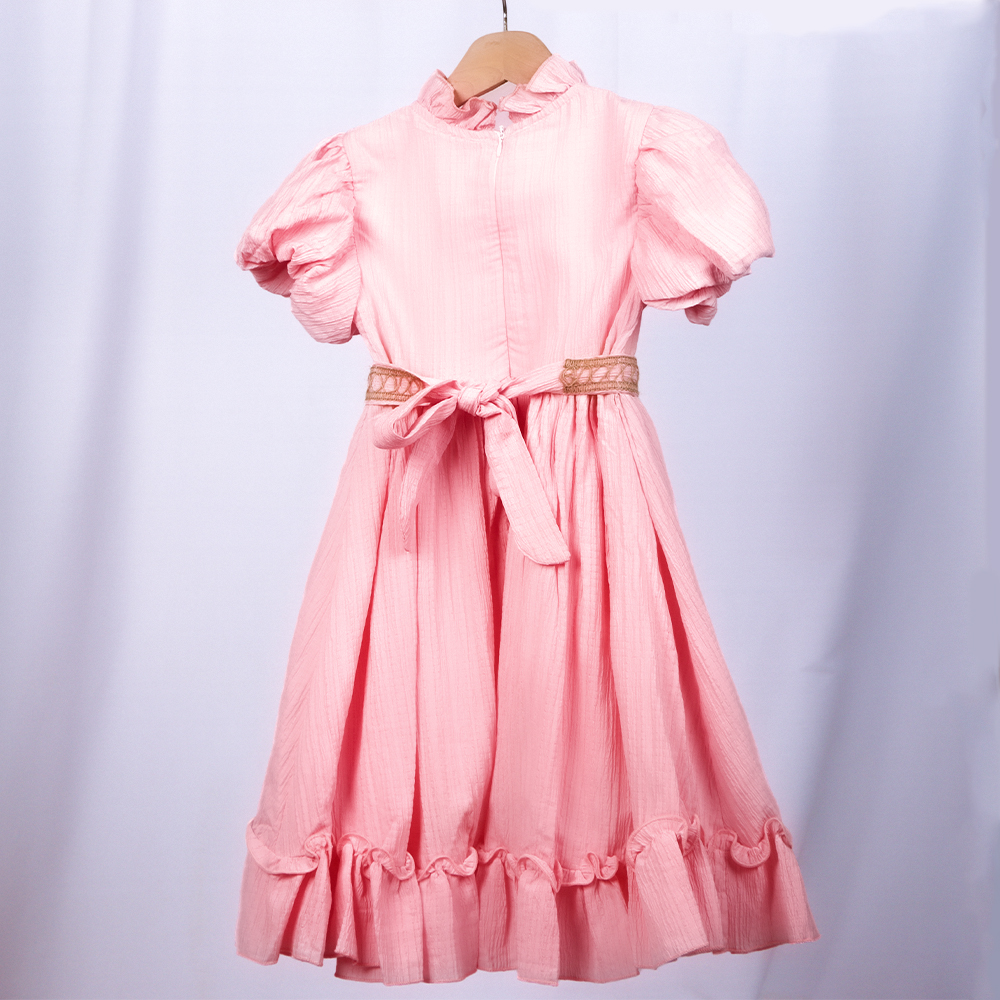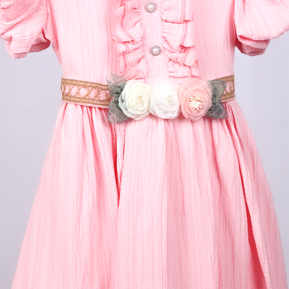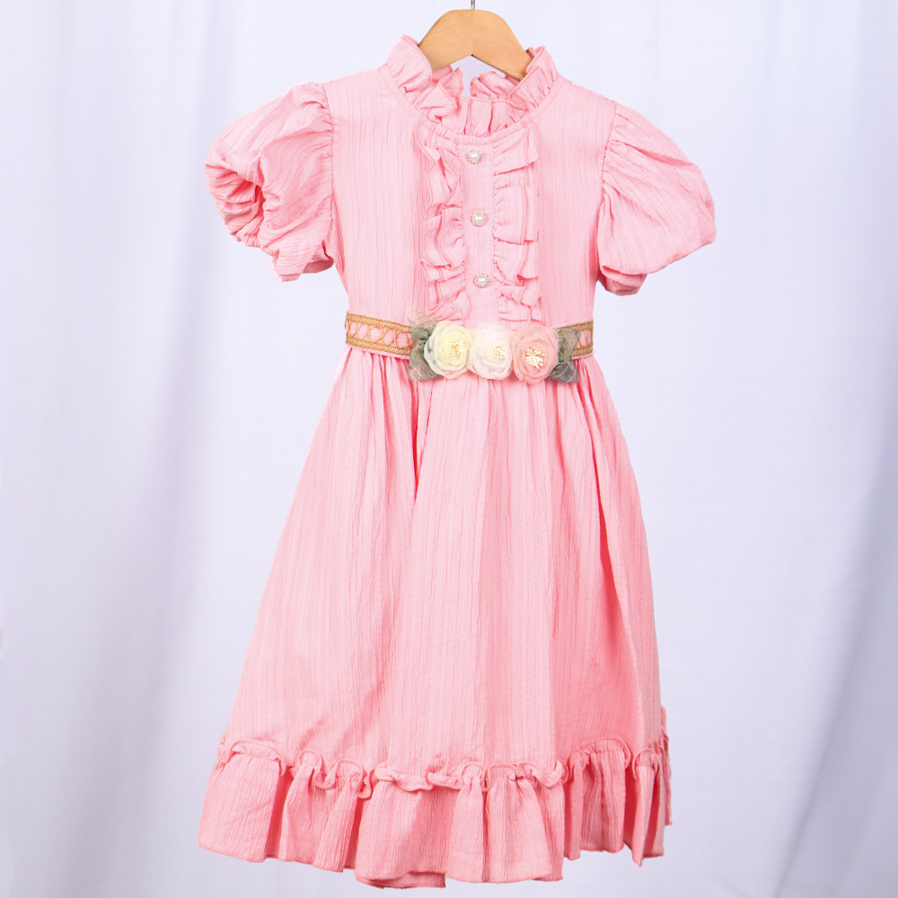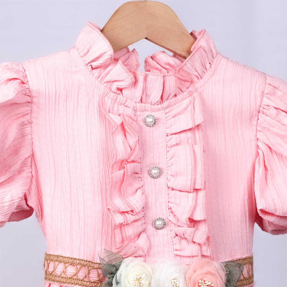 تصميم أنثوي راقٍ بلون وردي، أكمام قصيرة منفوشة، كشكشة أمامية وياقة أنيقة، خصر محدد بحزام مزين بزهور، وتنورة طويلة بحافة مكشكشة |