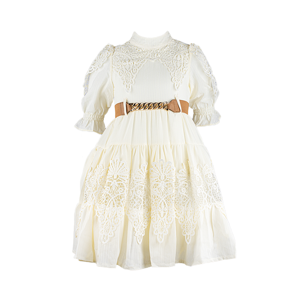 فستان أنيق بلون أبيض كريمي، ياقة مرتفعة ناعمة، أكمام قصيرة منفوشة بحواف مطاطية، تطريز دانتيل راقٍ على الصدر والتنورة، خصر محدد بحزام بلون بني مع سلسلة ذهبية تضيف لمسة فاخرة |