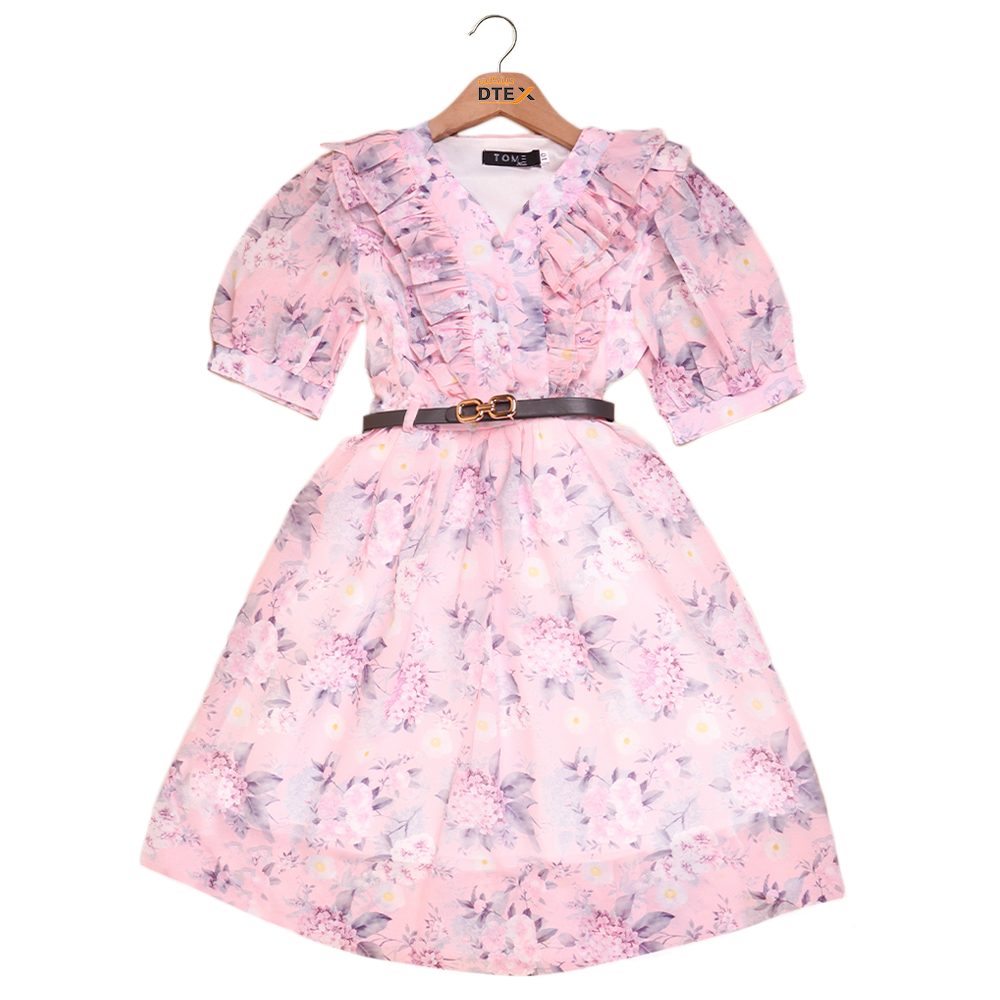تصميم بناتي انيق بنقشة زهور وكشكشة أمامية مع حزام خصر عصري |