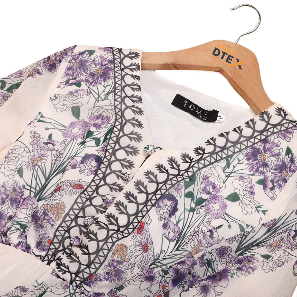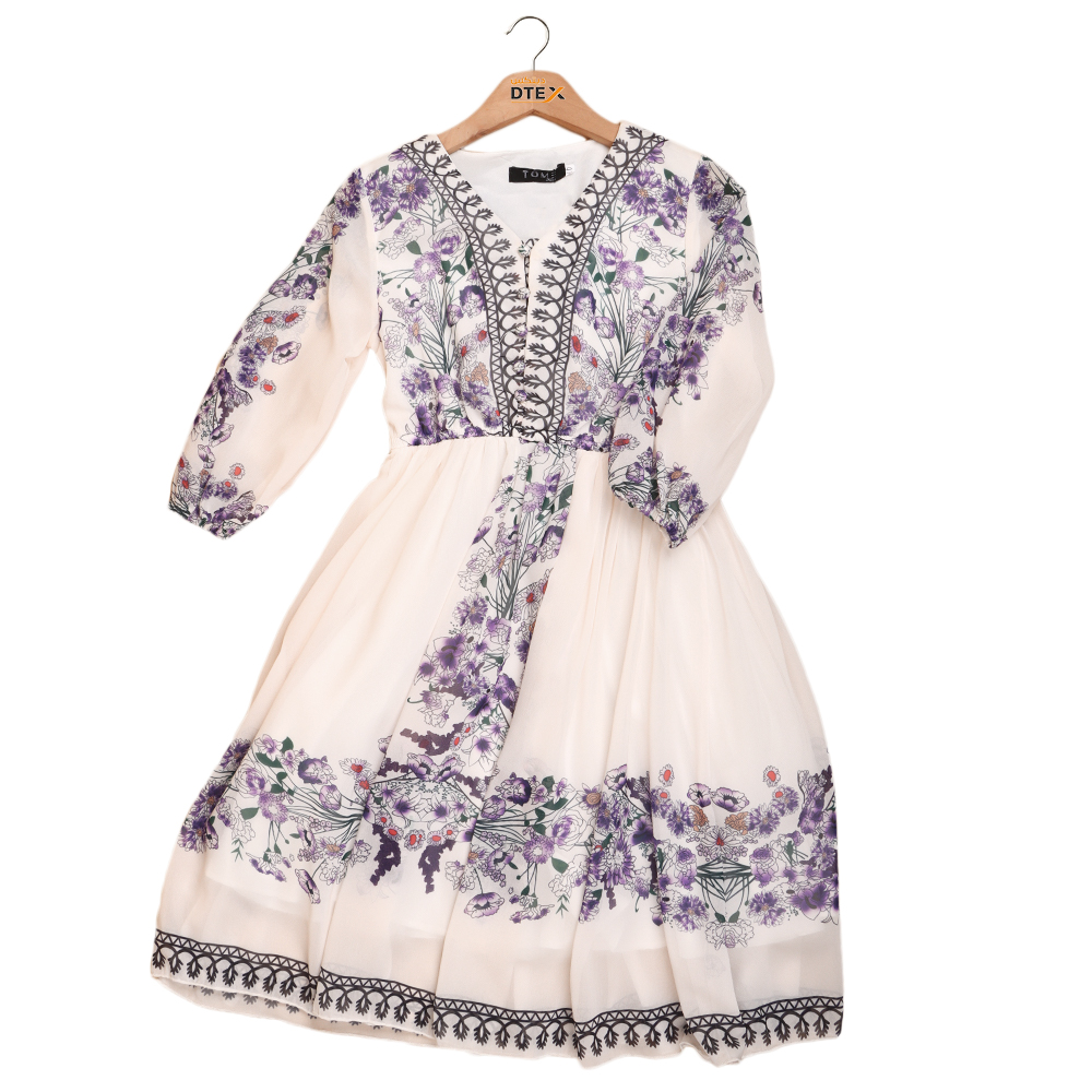 لفستان مصنوع من قماش أبيض كريمي ناعم مطبوع بنقوش زهرية بنفسجية وخضراء على الصدر والأكمام والحافة السفلية. يتميز بياقة على شكل حرف V مزينة بتطريز أسود أنيق، وأكمام بطول ثلاثة أرباع ذات نهايات مطاطية لراحة أكبر. الخصر محدد بخياطة ناعمة تمنح الفستان توازناً في القوام، بينما تمنح التنورة الواسعة حركة انسيابية أنثوية رائعة.