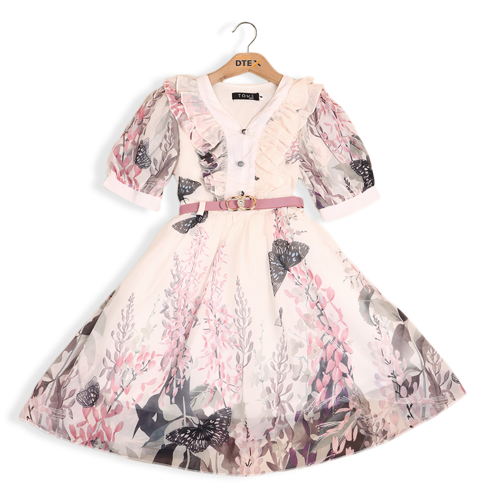 هذا الفستان مصنوع من قماش خفيف بنقوش مطبوعة عالية الجودة تمزج بين ألوان الباستيل الهادئة والدرجات الرمادية الرقيقة. يأتي بقصة متوسطة الطول وأكمام منفوخة نصفية تضيف لمسة من الرقي، بينما تضيف الكشكشة على الصدر والياقة لمسة كلاسيكية أنثوية. الحزام الوردي المزود بإبزيم ذهبي مزدوج يمنح الفستان شكلاً متناسقًا وأنيقًا. يناسب هذا التصميم حفلات الزفاف، أعياد الميلاد، والمناسبات العائلية الراقية , مناسبات المدرسية .