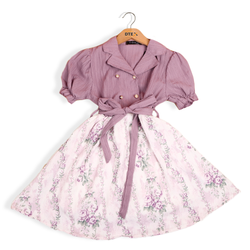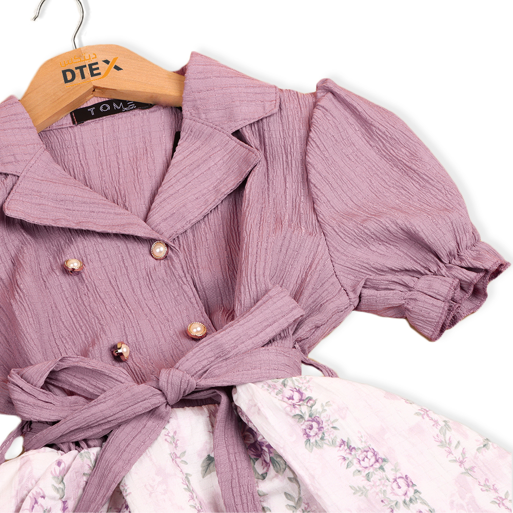الجزء العلوي من الفستان مصنوع بلون بنفسجي مطفي مع ياقة كلاسيكية وأزرار ذهبية لامعة تضيف لمسة فخمة. الأكمام قصيرة ومنتفخة بشكل خفيف مع شريط في الخصر يُربط على شكل فيونكة خلفية تضيف جمالًا ورقيًا. التنورة مزخرفة بنقوش وردية ناعمة على خلفية وردية باهتة لتمنح الفستان توازنًا متناغمًا في الألوان والتفاصيل.