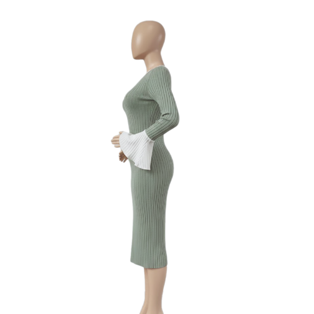الأكمام طويلة وتنتهي بكشكشة واسعة (أكمام الجرس) باللون الأبيض، مما يخلق توازناً بصرياً مع لون الفستان الأساسي |