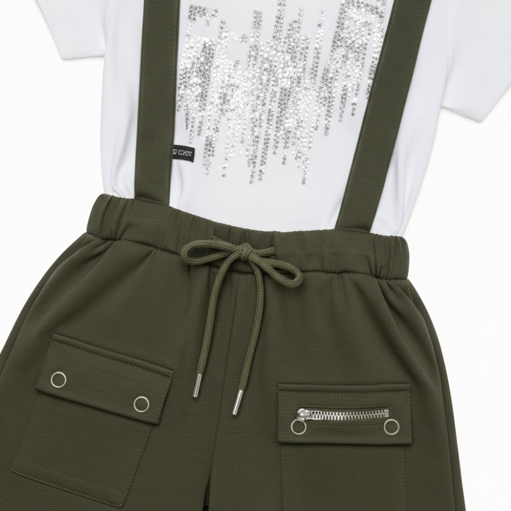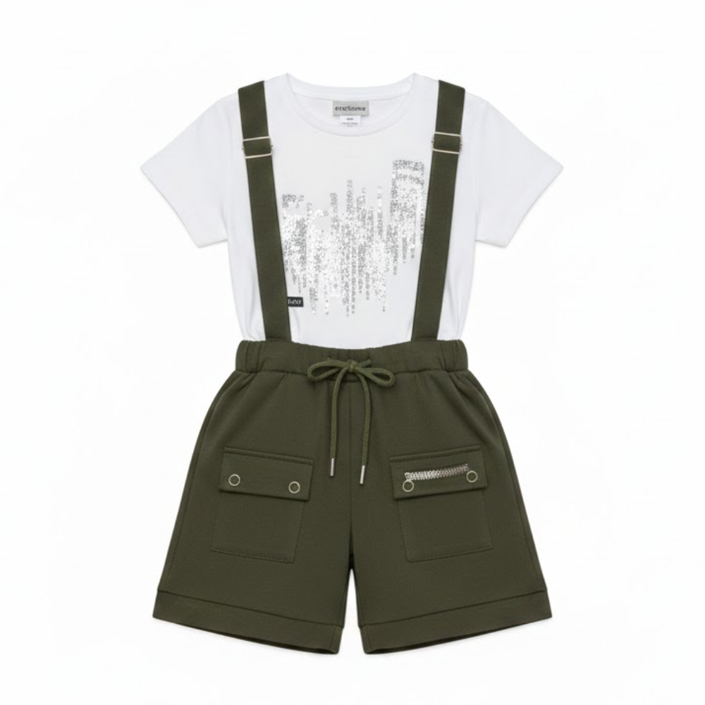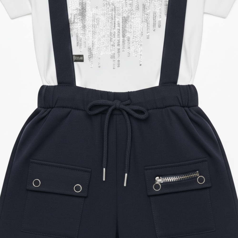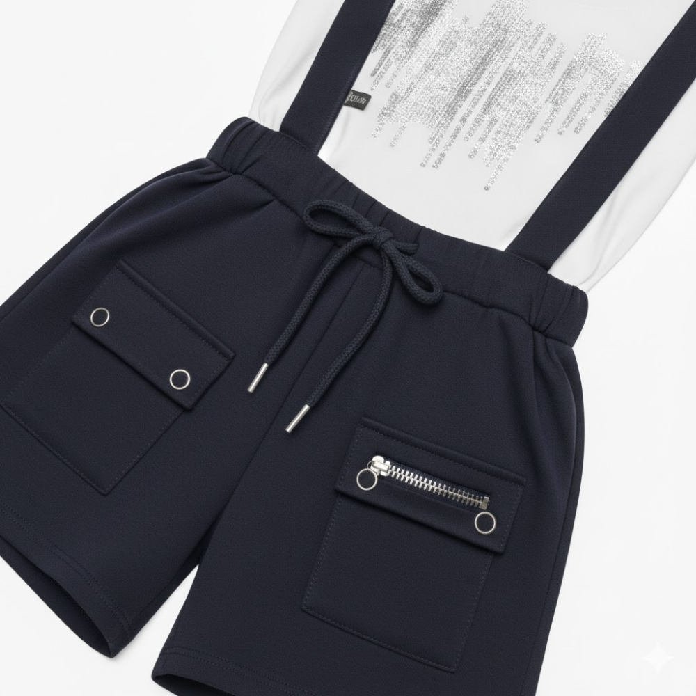 هذا الطقم الفريد الذي يجمع بين البساطة والتصميم الانيق وصُمم الشيال بقصة مستقيمة تماماً وحمالات متناسقة تمنح طفلك مظهراً مرتباً ومنضبطاً طوال اليوم ويأتي مع تيشيرت أبيض ناعم بياقة دائرية، ليشكل طقماً أكمل