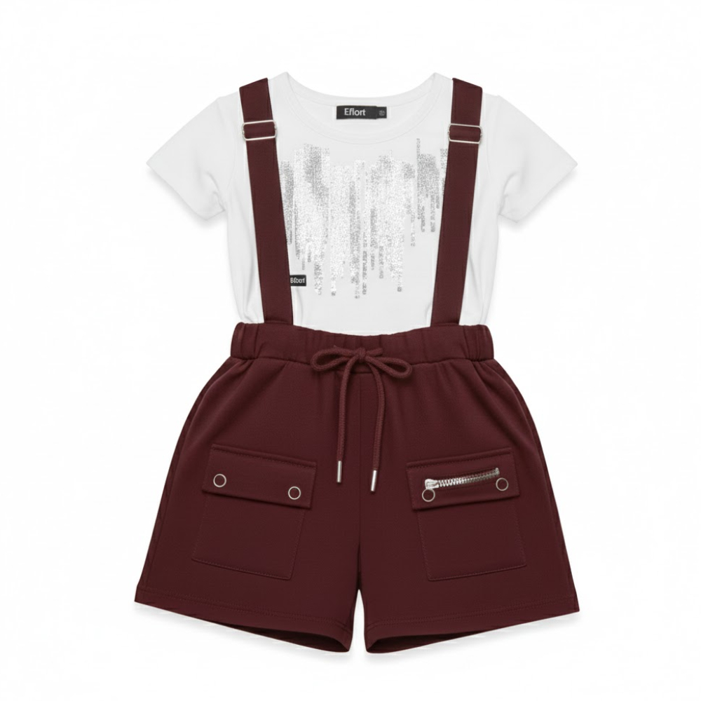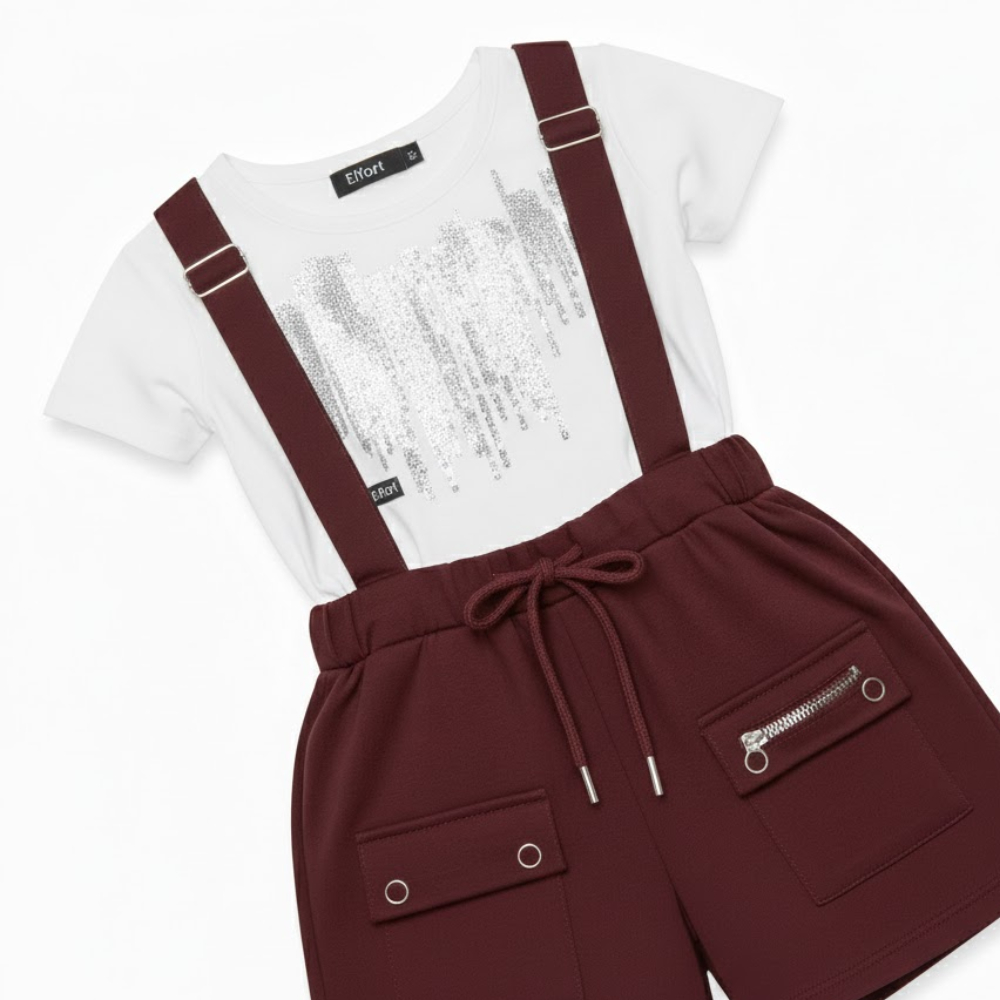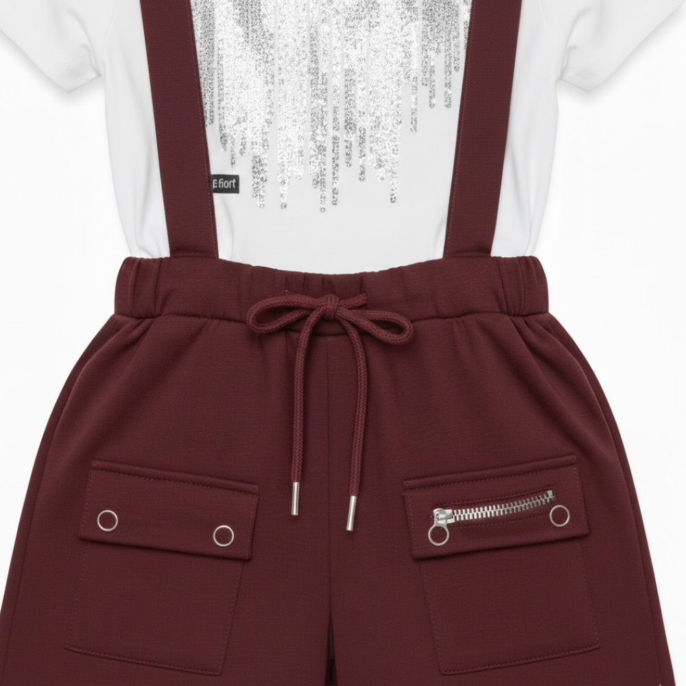 صُمم الطقم برؤية فنية تجعل من التيشيرت والشيال وحدة واحدة لا تتجزأ؛ حيث تتماشى ياقة التيشيرت الدائرية البيضاء مع انسيابية الحمالات العنابية، مما يخلق توازناً بصرياً مريحاً وجذاباً |