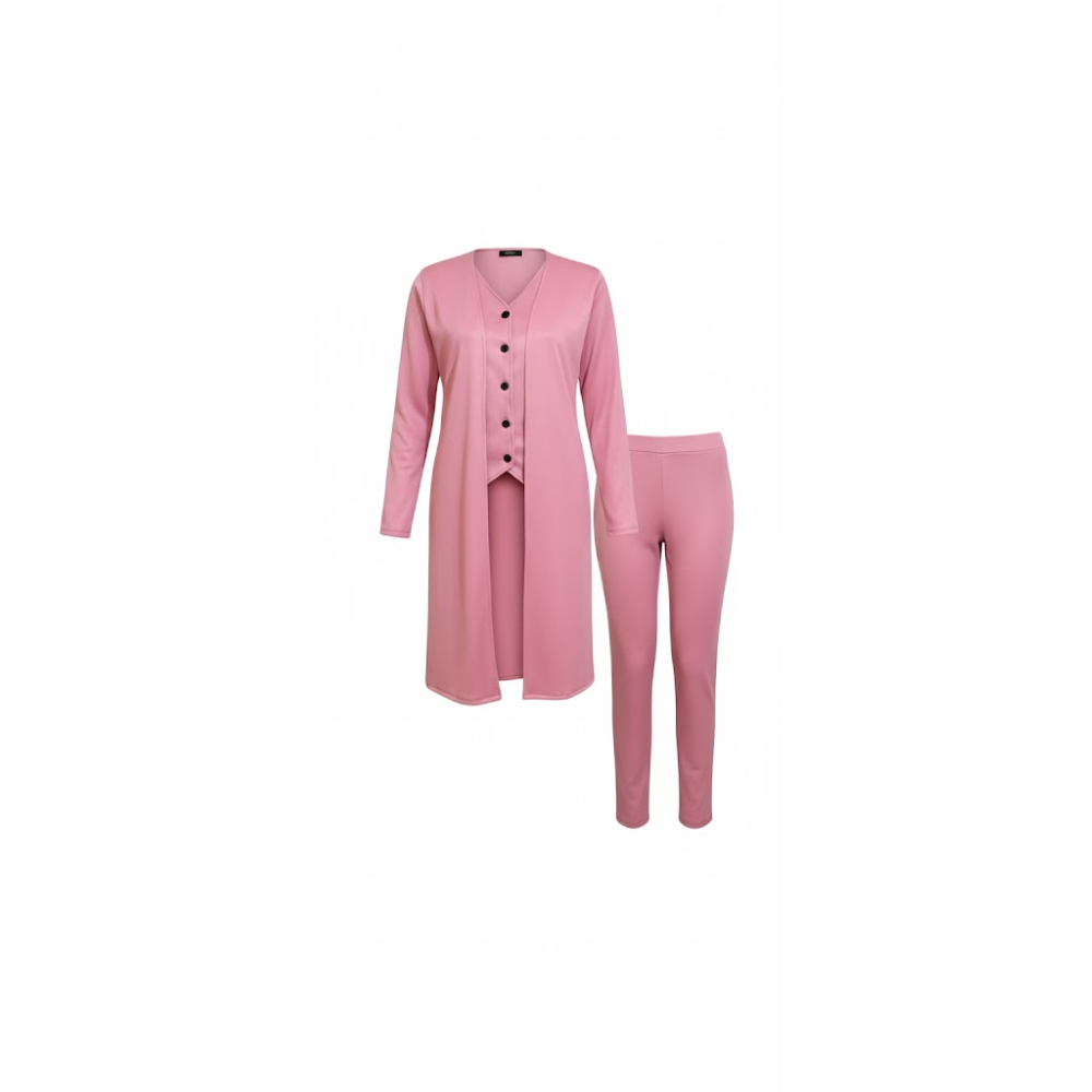 طقم نسائي يتميز بتصميم عصري وعملي، يجمع بين الأناقة المريحة والمظهر المتناسق. يطغى عليه لون وردي هادئ (ببيي بينك) يمنح شعوراً بالنعومة والأنوثة. يعتمد التصميم على فكرة التعدد في الطبقات بنفس درجة اللون، مما يجعله خياراً مثالياً للإطلالات اليومية أو الرسمية البسيطة التي تتطلب مظهراً مرتباً وموحداً. القماش ناعم الانسيابية، مما يوفر راحة وحرية في الحركة طوال اليوم.