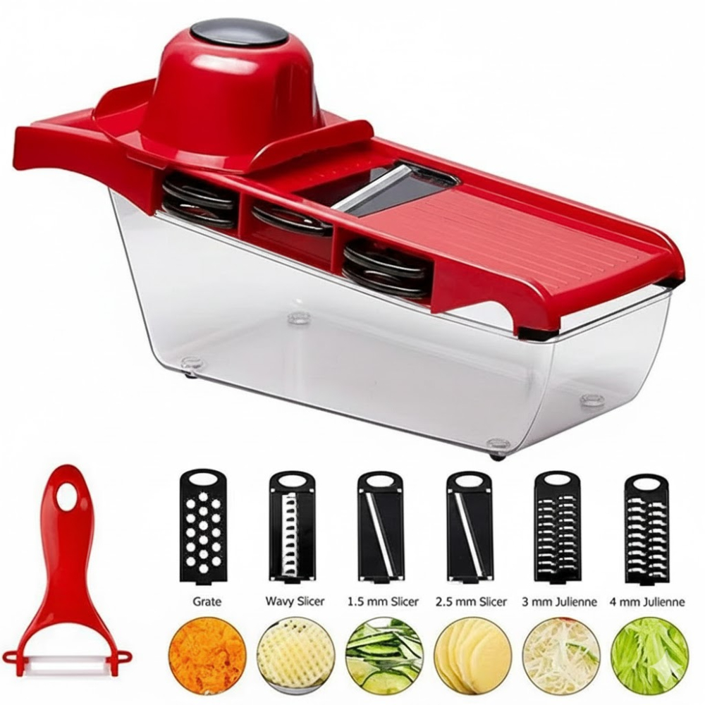القطاعة حلاً مطبخياً متكاملاً يهدف إلى تسريع عملية تحضير الطعام ورفع كفاءة التقطيع اليدوي. وتتميز بكونها أداة متعددة الأغراض تتيح للمستخدم إنجاز مهام متنوعة باستخدام جهاز واحد فقط. توفر المجموعة عدة شفرات قابلة للتبديل تتيح الحصول على أشكال مختلفة مثل الشرائح، البشر، وأصابع الخضروات بأحجام دقيقة ومتساوية. صُممت الأداة لتقوم بالتقطيع مباشرة داخل حاوية مدمجة، مما يحافظ على ترتيب المكان ويمنع الفوضى أثناء العمل. يتميز التصميم بإمكانية تخزين الملحقات والشفرات داخل جسم الأداة نفسه، مما يسهل عملية التخزين في الخزائن المزدحمة. تتضمن الأداة ملحقات مخصصة لحماية اليدين من الشفرات الحادة أثناء الاستخدام، مما يجعل عملية التحضير أكثر أماناً مقارنة بالسكاكين التقليدية. تجهيز أولي شامل: يأتي المنتج مع أدوات إضافية للمساعدة في تجهيز المكونات قبل البدء في عملية التقطيع أو البشر.