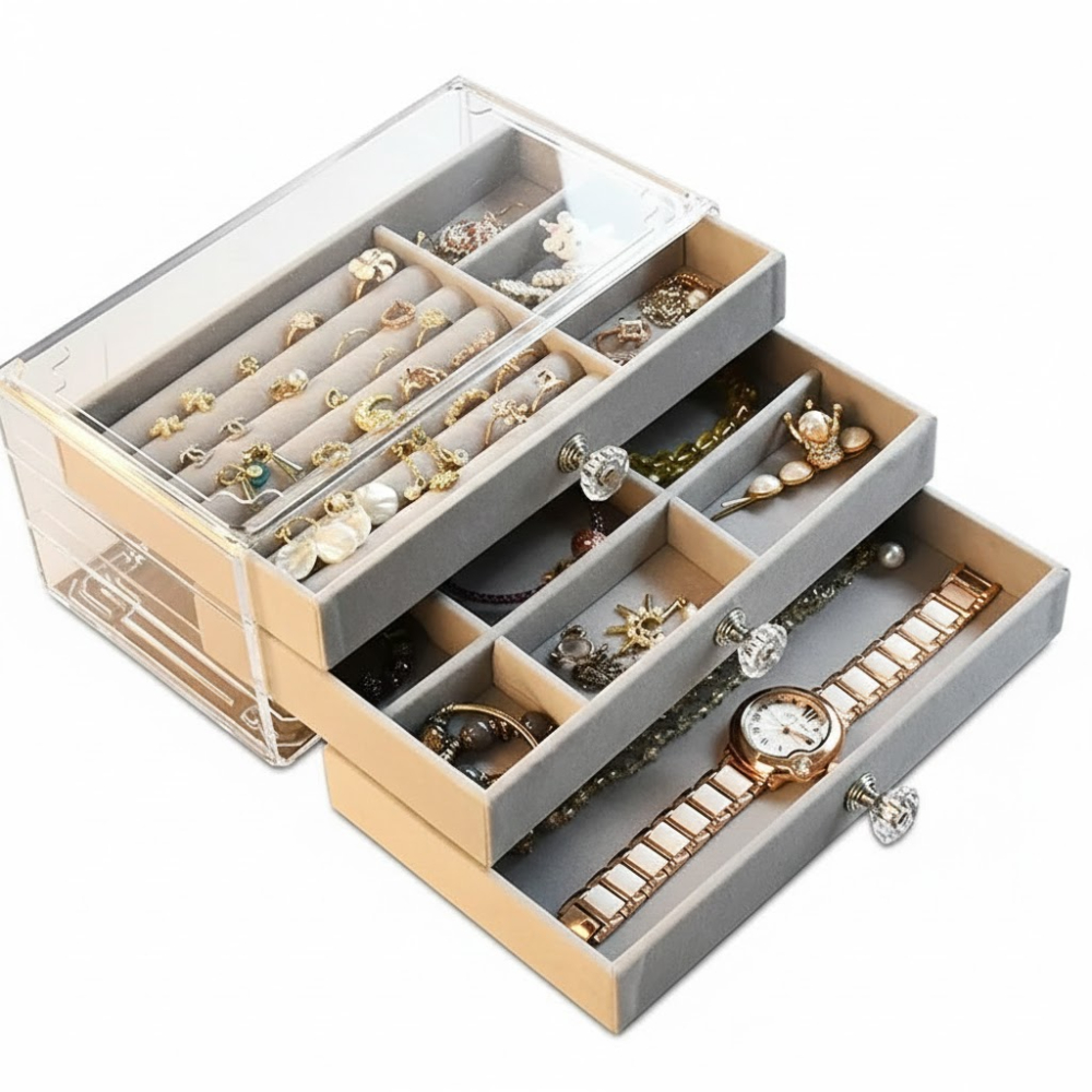صندوق تنظيم مجوهرات وإكسسوارات مبطن باالمخمل ويتكون من ثلاث طبقات، مصمم لحفظ المقتنيات الثمينة والصغيرة بشكل مرتب وآمن. يستخدم لتنظيم الخواتم، الأقراط، السلاسل، والأساور بشكل يمنع تشابكها. يحتوي على مساحات واسعة تناسب الساعات أو القطع الكبيرة. يعمل الغطاء الشفاف والأدراج على حماية المقتنيات من الأتربة والعوامل الخارجية. بفضل تصميمه الأنيق، يُستخدم كقطعة تجميلية على تسريحة غرفة النوم.