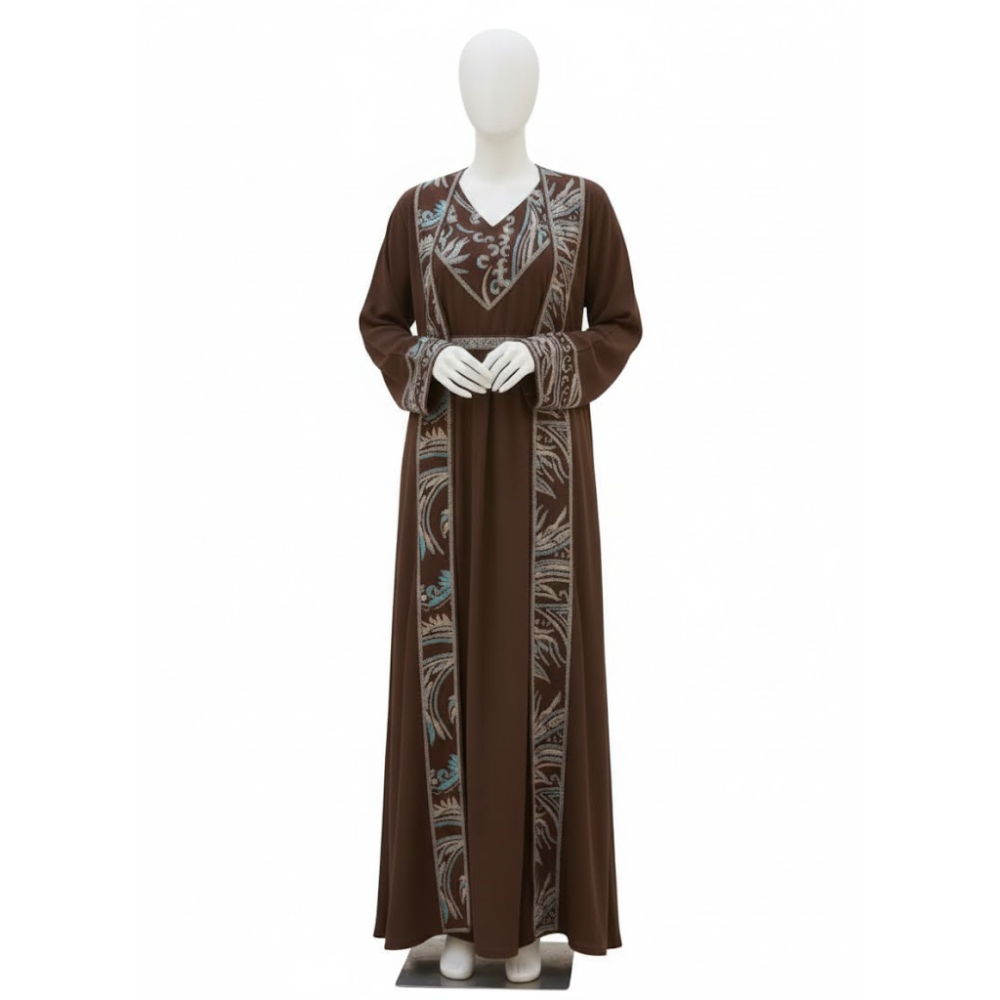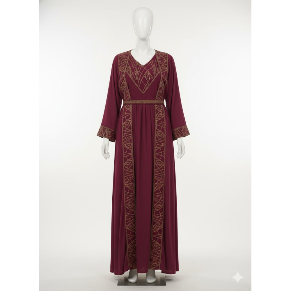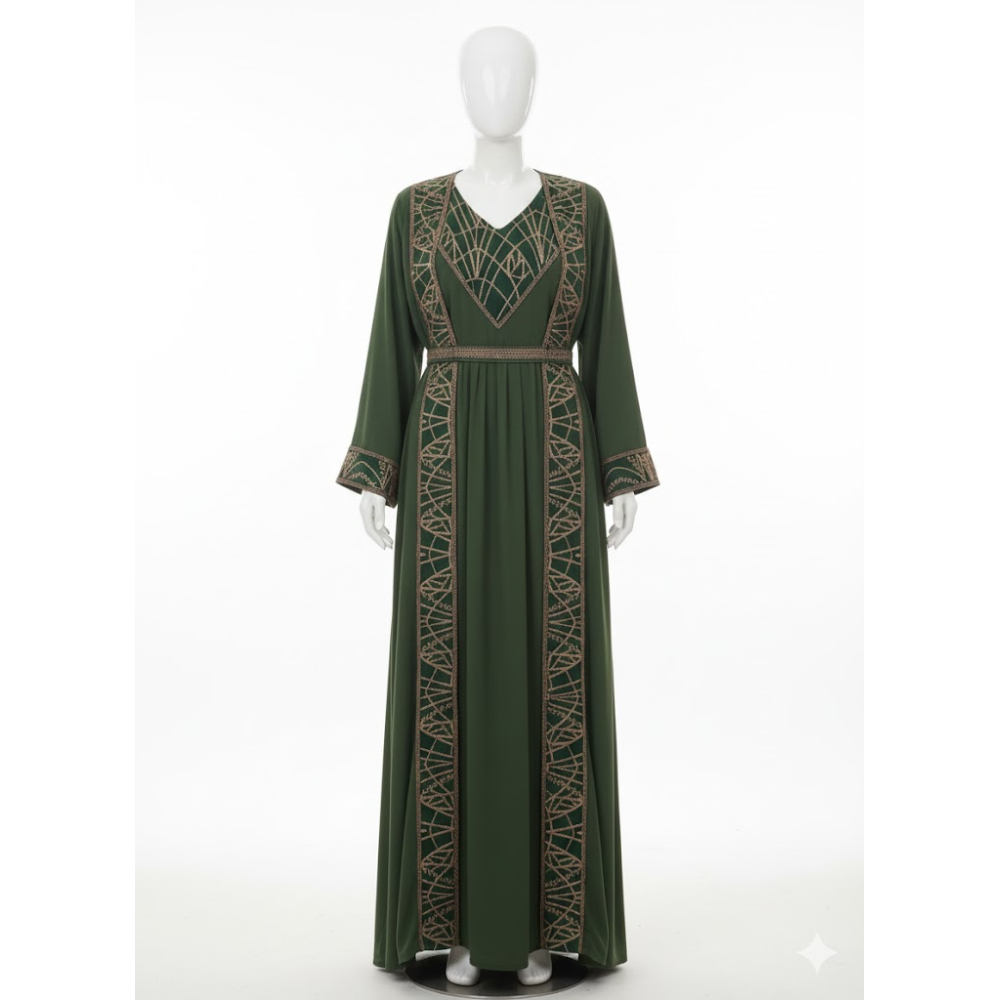 جلابية نسائية فاخرة تتميز بتصميم يجمع بين الاحتشام والأناقة العصرية. تأتي بقصة طويلة ومنسدلة تنساب بنعومة على الجسم، مع تطريزات هندسية تزين منطقة الصدر والأكمام وتمتد طوليًا لتعطي مظهرًا يوحي بالطول والرشاقة. تصميمها يعتمد على نظام الطبقات المدمجة مع حزام يحدد الخصر، مما يمنحها طابعًا ملكيًا يناسب المناسبات والاحتفالات.