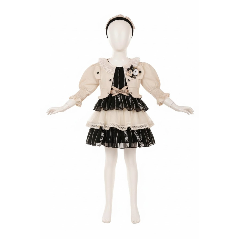 طقم فستان بناتي كلاسيكي مكون من قطعتين بتصميم يجمع بين الأناقة والفخامة. يتميز الفستان بتنورة منفوشة من طبقات متعددة، مع جاكيت قصير (بوليرو) يضفي لمسة من الرقي، مما يجعله مثالياً للمناسبات الرسمية والأعياد.