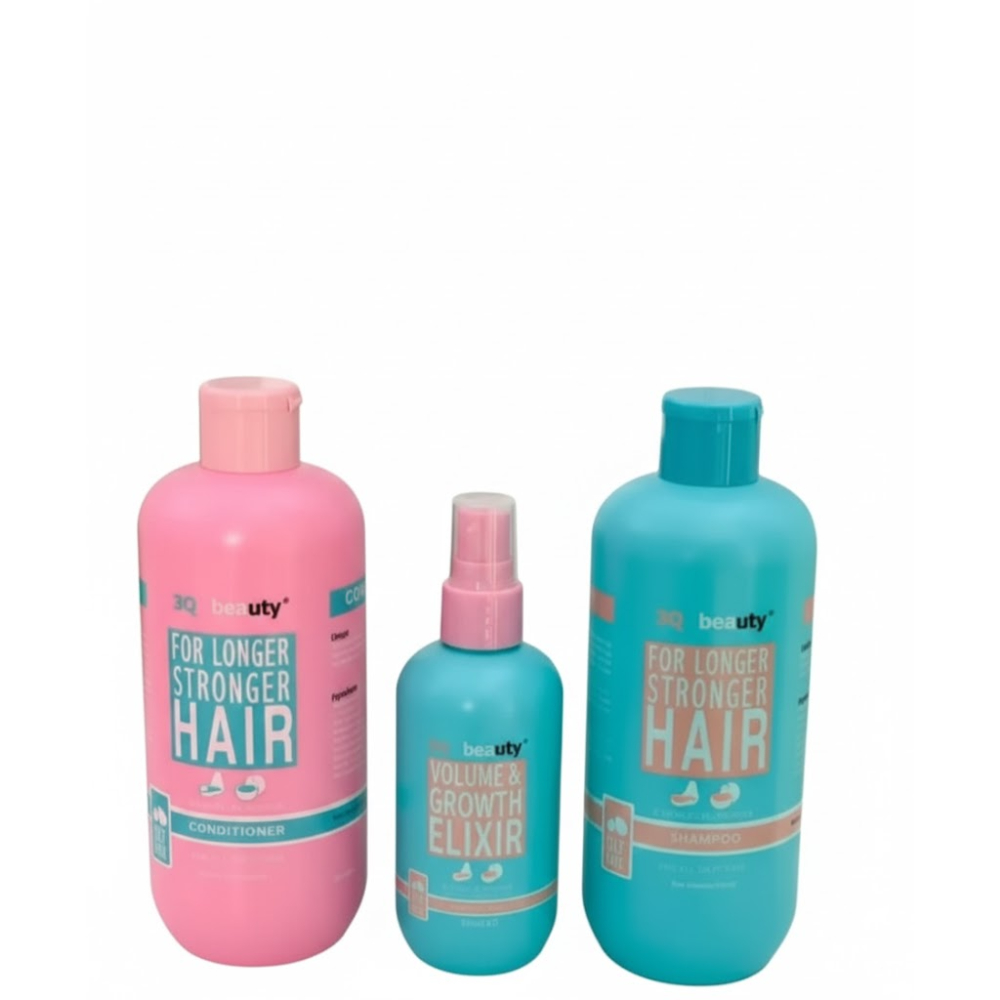 مجموعة متكاملة للعناية بالشعر من العلامة التجارية "3Q Beauty"، مصممة خصيصاً لتعزيز نمو الشعر وزيادة قوته وطوله.