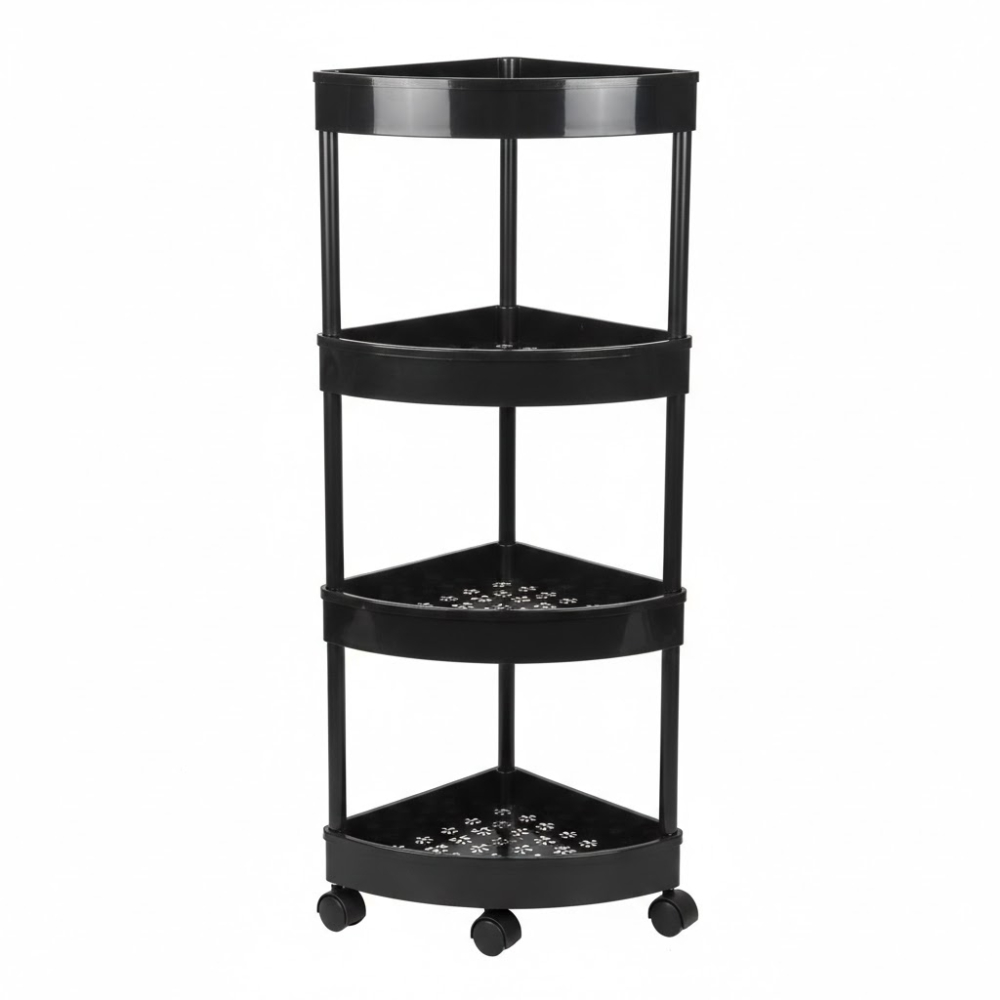 منظم تخزين مصمم بشكل عملي للمساعدة في ترتيب الأغراض وتوفير المساحة في مختلف أركان المنزل. يتميز بتصميم مخصص للزوايا، ويحتوي على عدة أرفف توفر مساحة كافية لتنسيق المستلزمات المتنوعة، مع وجود عجلات في القاعدة لتسهيل عملية نقله وتحريكه بسلاسة.