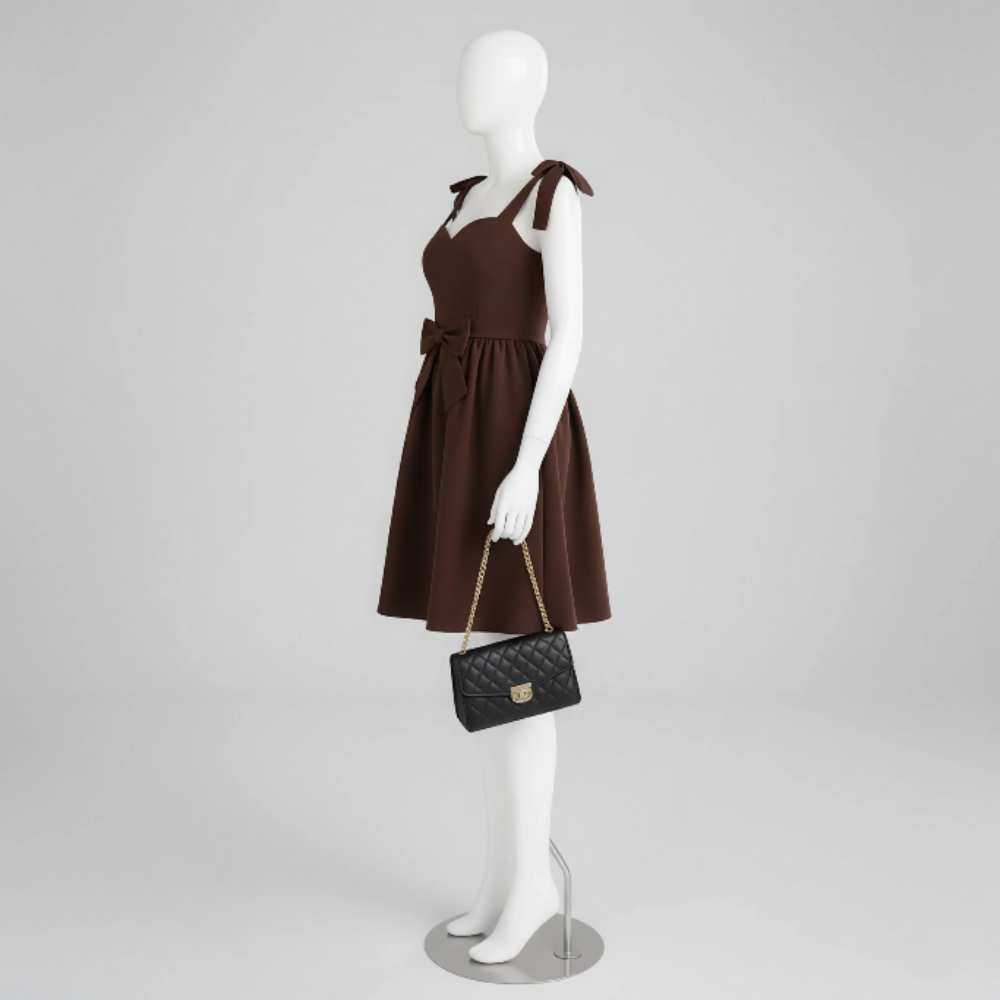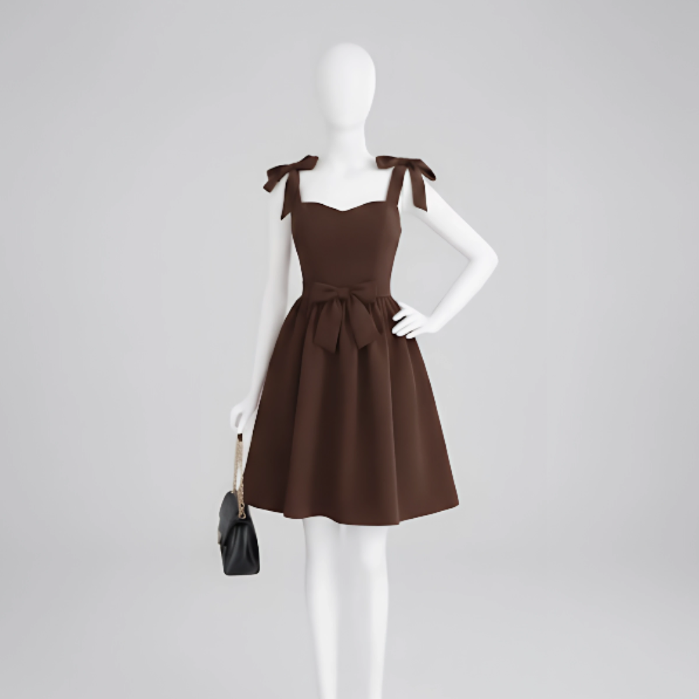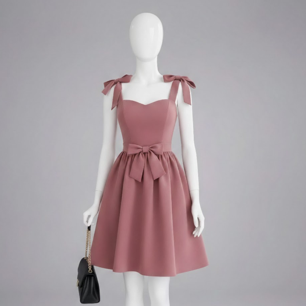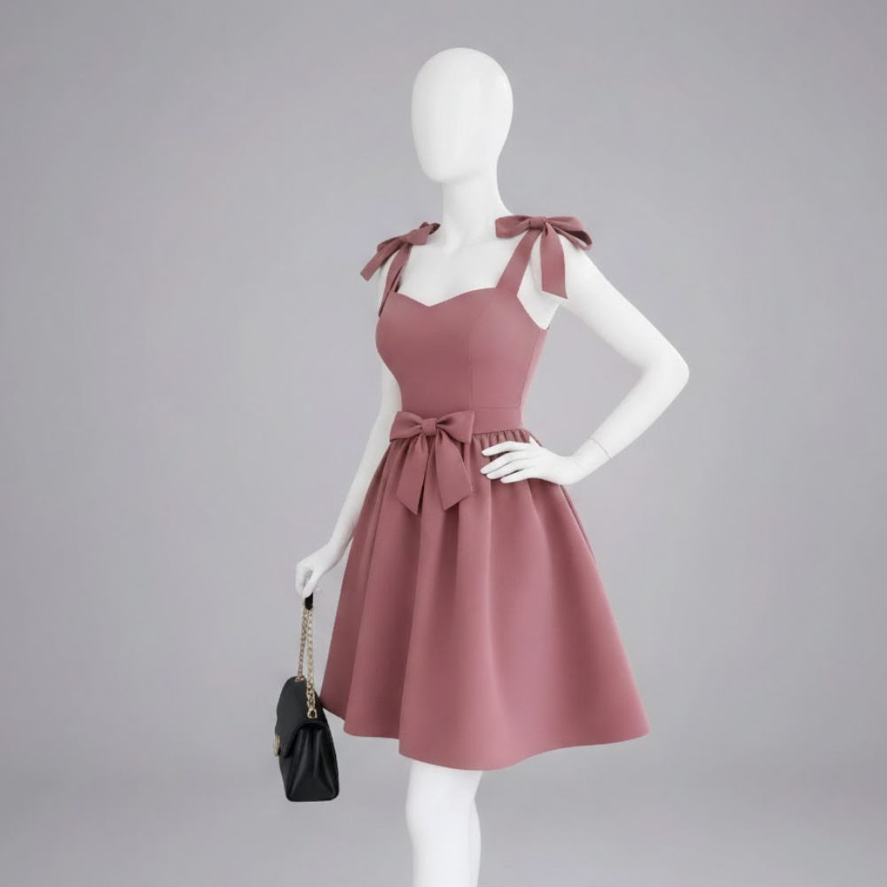 مزود بحزام قماشي مدمج ينتهي بفيونكة مركزية أنيقة، مما يبرز نحافة الخصر ويمنح الفستان شكلاً متوازنًا وللحصول على إطلالة متكاملة، نسقيه مع حذاء ذو كعب عالٍ بلون "نود" أو فضي، واعتمدي تسريحة شعر مرفوعة لإبراز تفاصيل الفيونكات على الأكتاف