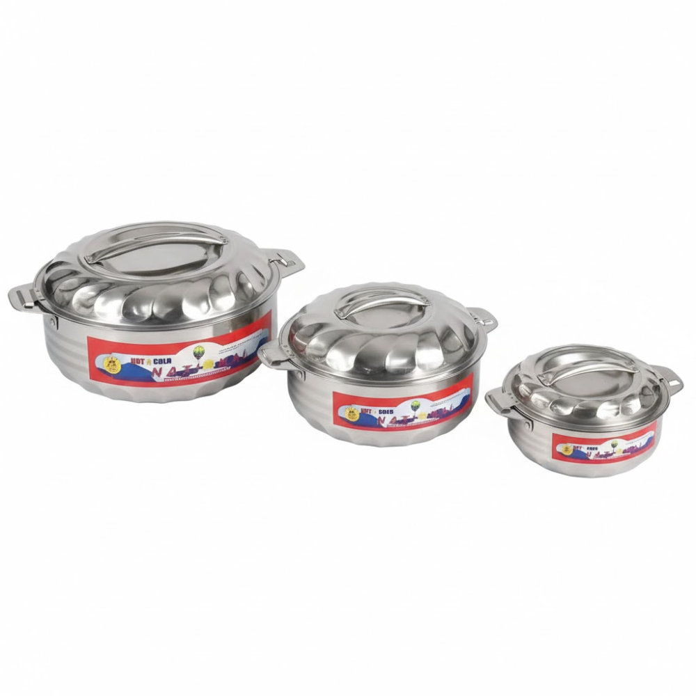 طقم حافظات طعام معدنية متكامل، يعمل بنظام العزل الحراري للحفاظ على برودة أو سخونة المأكولات. يتميز بهيكل متين وأحجام متنوعة تلبي مختلف متطلبات الضيافة والتقديم المنزلي بشكل عصري.
