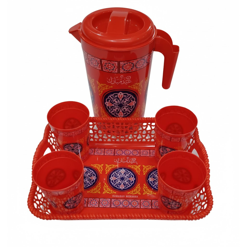 طقم ضيافة متكامل مخصص لتقديم المشروبات، يتألف من وعاء كبير للسوائل ومجموعة من الأكواب وصينية حمل موحدة التصميم. يتميز الطقم بنقوش احتفالية تعكس الأجواء المناسباتية، وهو مصمم ليكون أداة عملية وجميلة في آن واحد لخدمة العائلة والضيوف.