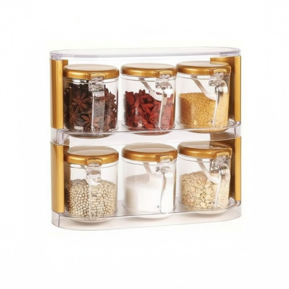 طقم منظم توابل من طابقين يتميز بتصميم عصري وأنيق يجمع بين الشفافية واللون الذهبي. يتكون من 6 عبوات شفافة مرتبة بشكل رأسي لتوفير المساحة على سطح المطبخ، وهي مصممة لتسهيل الوصول إلى المكونات واستخدامها أثناء الطهي.