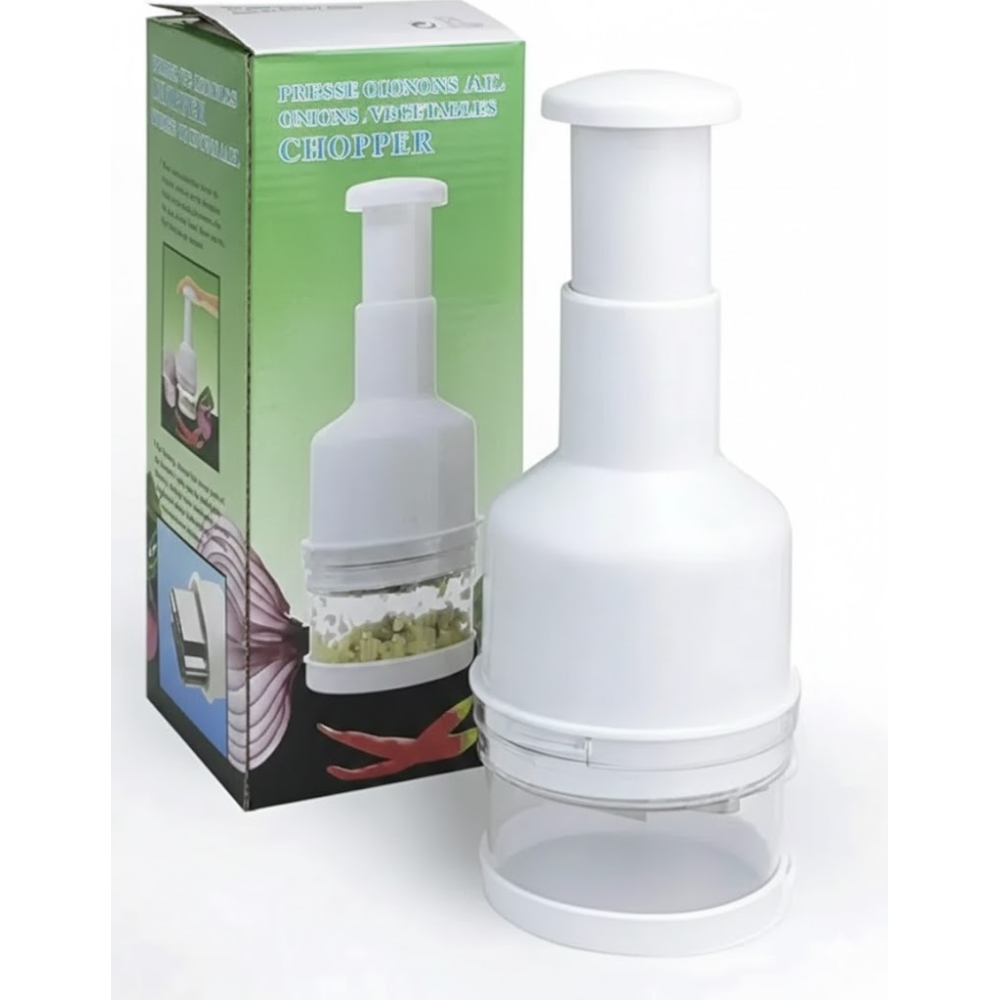أداة مطبخ يدوية لفرم وتقطيع الخضروات. تعتمد فكرتها على نظام الضغط الميكانيكي المتكرر لتحريك شفرات داخلية حادة تقوم بتقسيم الطعام إلى قطع صغيرة. صُممت لتكون بديلاً آمناً وسريعاً للسكاكين التقليدية، حيث تتيح للمستخدم التحكم في درجة نعومة الفرم من خلال عدد الضغطات، مع الحفاظ على نظافة المكان بفضل وعاء التجميع المدمج.