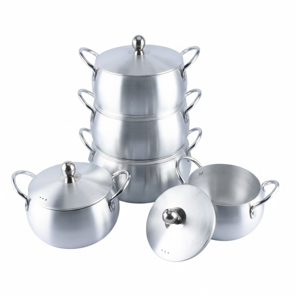 طقم أواني طهي (قدور) كلاسيكي مصنوع من المعدن، مصمم بأسلوب عملي ليلائم الاستخدامات اليومية المتعددة في المطبخ.