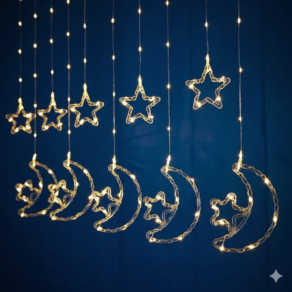 وسيلة إضاءة زخرفية مصممة لإضفاء لمسة جمالية واحتفالية على الأماكن. تعتمد فكرتها على سلاسل ضوئية متدلية تحمل أشكالاً رمزية مضيئة، مما يجعلها خياراً مثالياً لتزيين الجدران والنوافذ في المناسبات السعيدة والأعياد.
