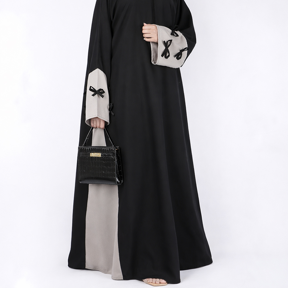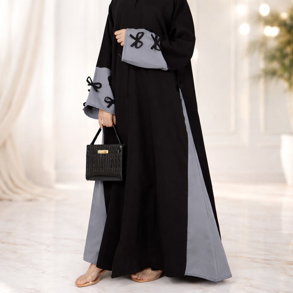عباية راقية تجمع بين لونين بتصميم عصري مميز، مزينة بفيونكات ناعمة على الأكمام تضيف لمسة أنثوية جذابة، لتمنحك إطلالة محتشمة وفخمة في آنٍ واحد.
