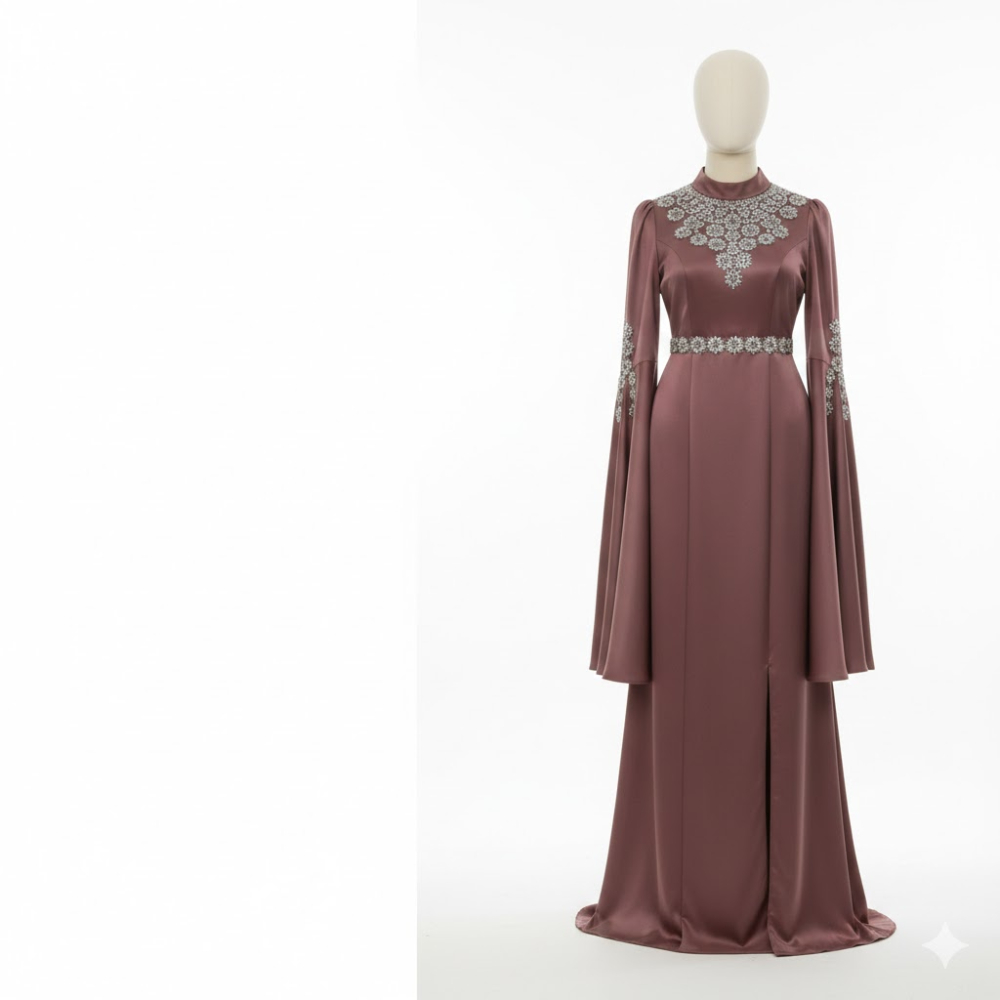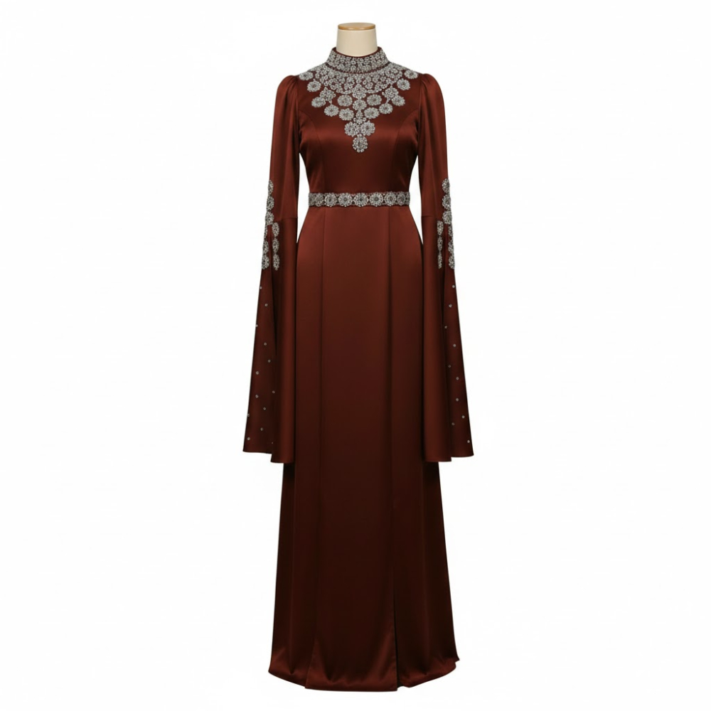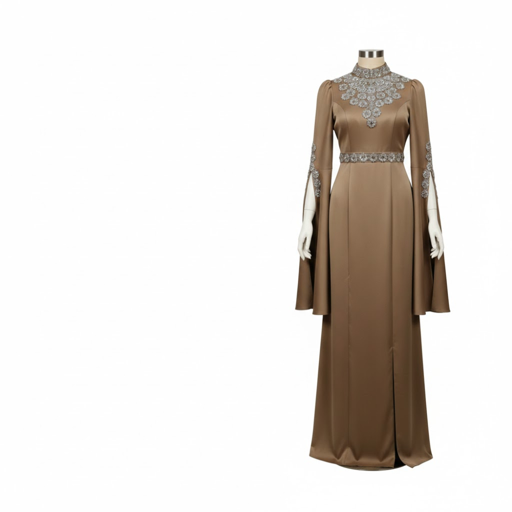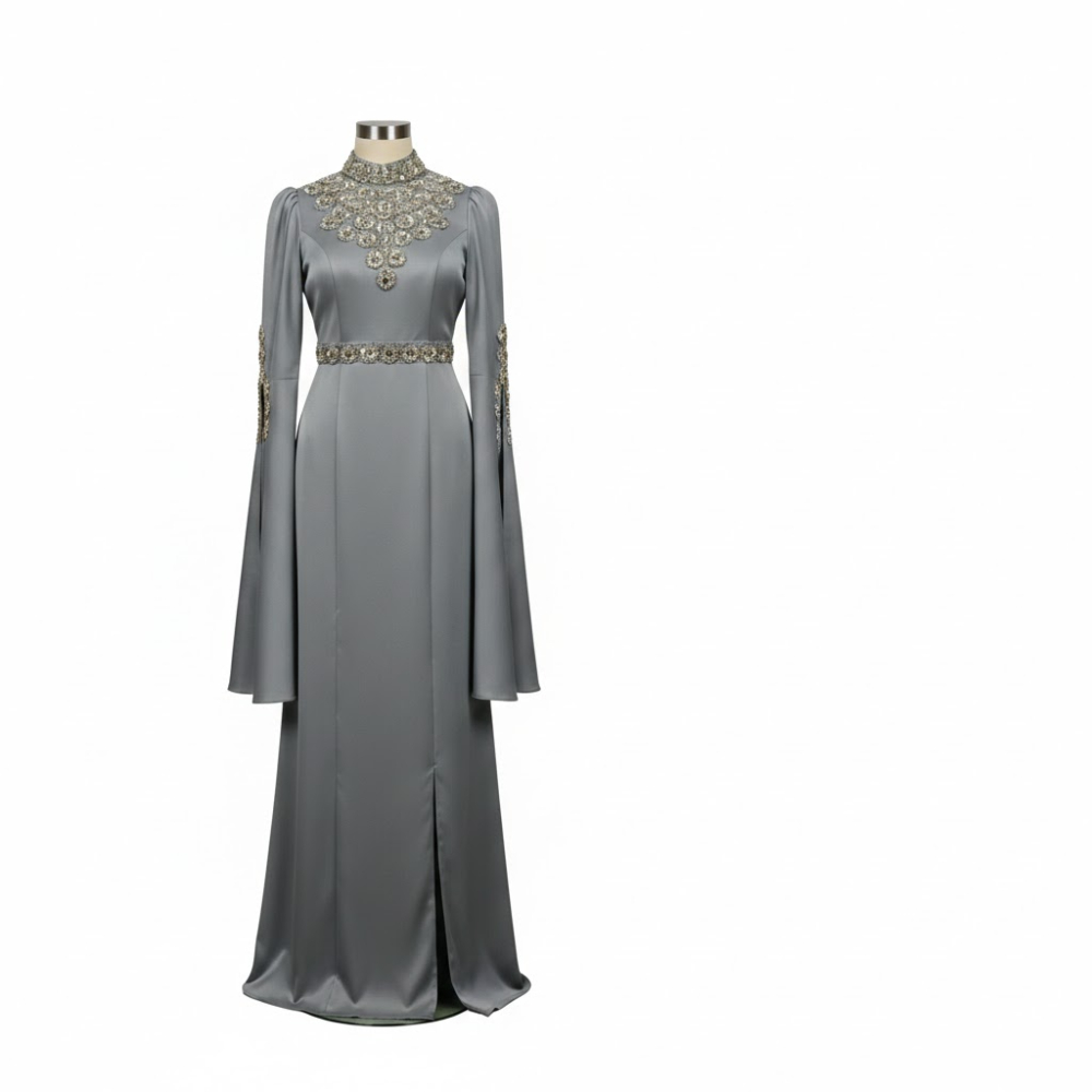 فستان سهرة ملكي يتميز بتصميم محافظ يجمع بين الرقي والحداثة، مع ياقة مرتفعة وأكمام واسعة تمنح مظهراً انسيابياً فاخراً. يزدان الخصر والصدر بتطريزات يدوية دقيقة تضفي بريقاً ساحراً، مما يجعله القطعة المثالية للمناسبات الرسمية التي تتطلب حضوراً لافتاً.