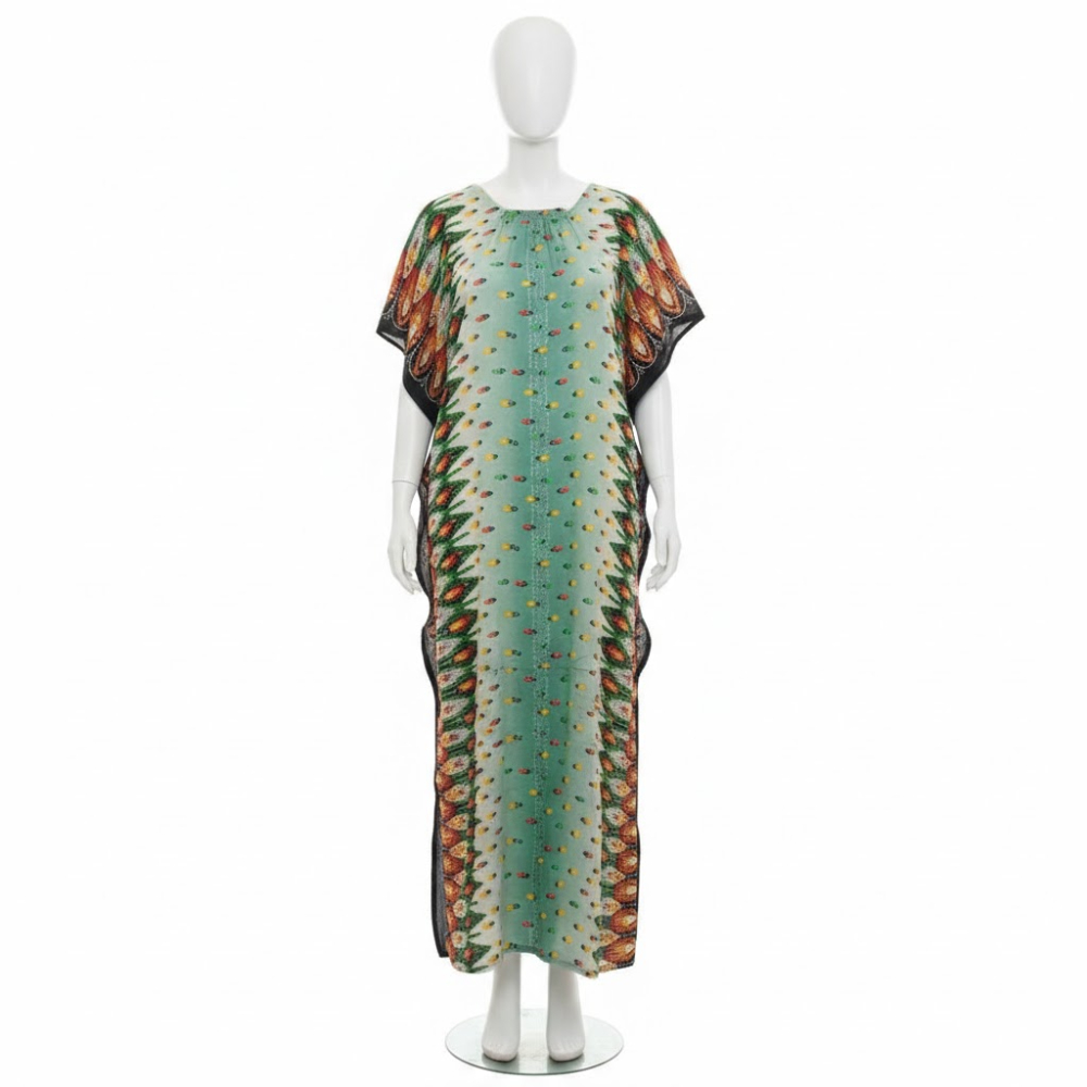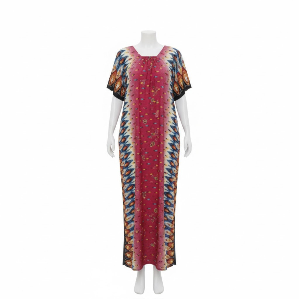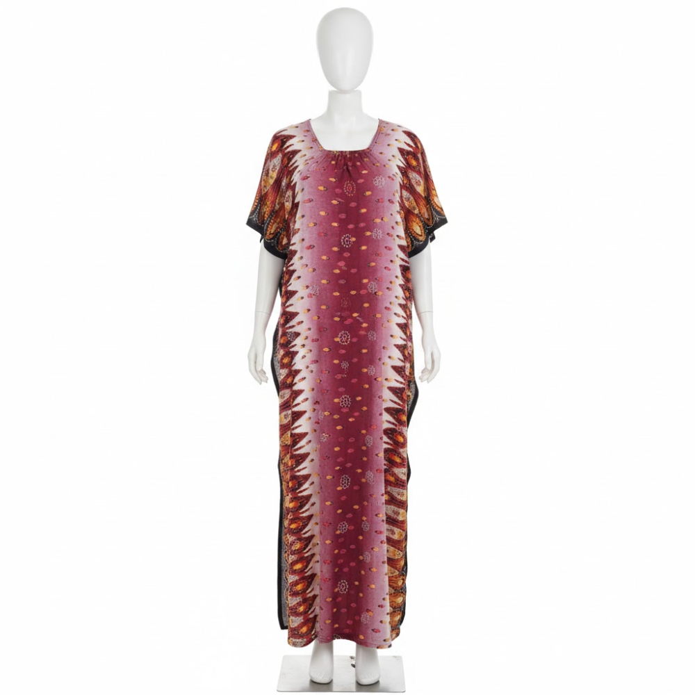 روب نسائي طويل بتصميم فضفاض وأكمام قصيرة، يتميز بنمط زخرفي متداخل يجمع بين النقوش الهندسية والرسومات التجريدية الممتدة على كامل التصميم.