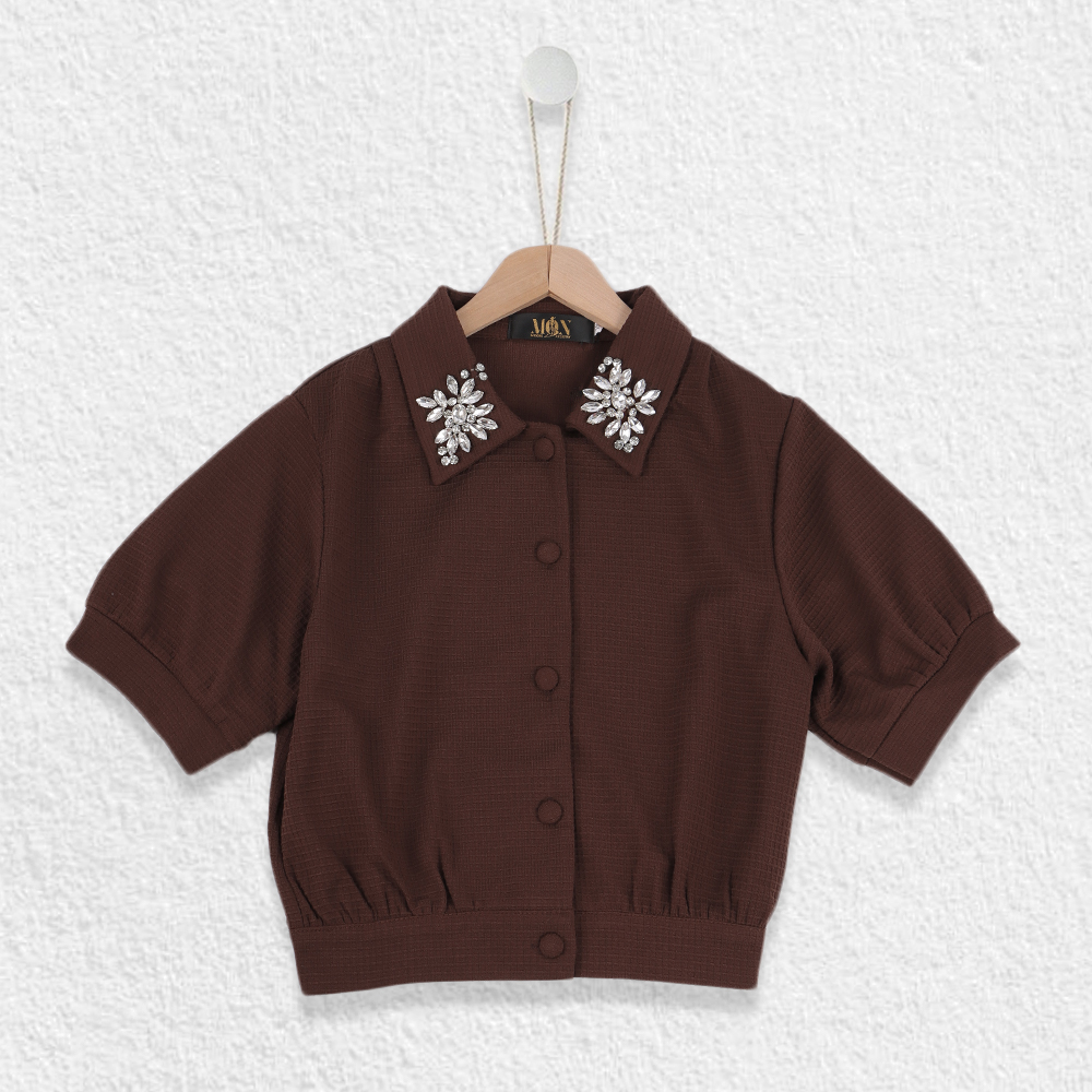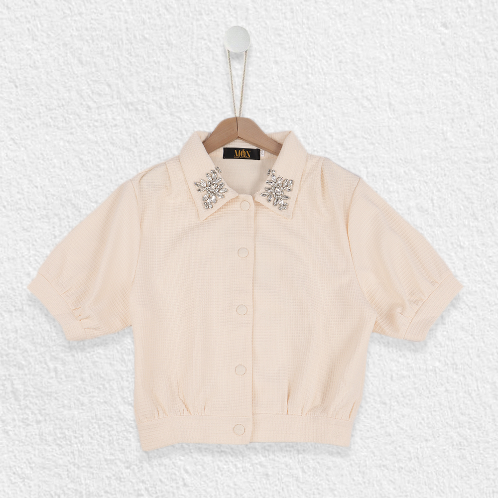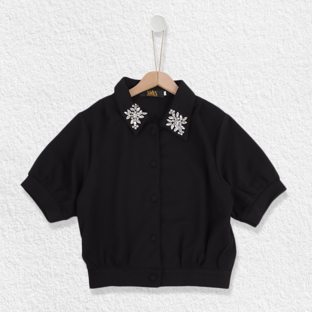 بلوزة أطفال أنيقة كلاسيكي، تتميز بياقة مزينة بتطريز فاخر مع فصوص لامعة تضيف لمسة راقية وجذابة، لتمنح طفلتك إطلالة مميزة في المناسبات المختلفة.