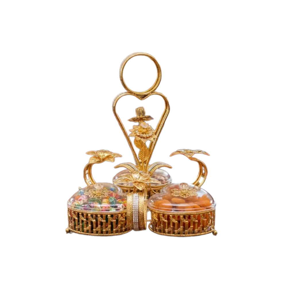 تنظيم الضيافة: يجمع المكسرات والحلويات في قطعة واحدة أنيقة بدلاً من استخدام أطباق متعددة. تعدد الاستخدامات: يصلح كقطعة ديكور فاخرة للمجالس أو كهدية قيمة في المناسبات والزيارات. |