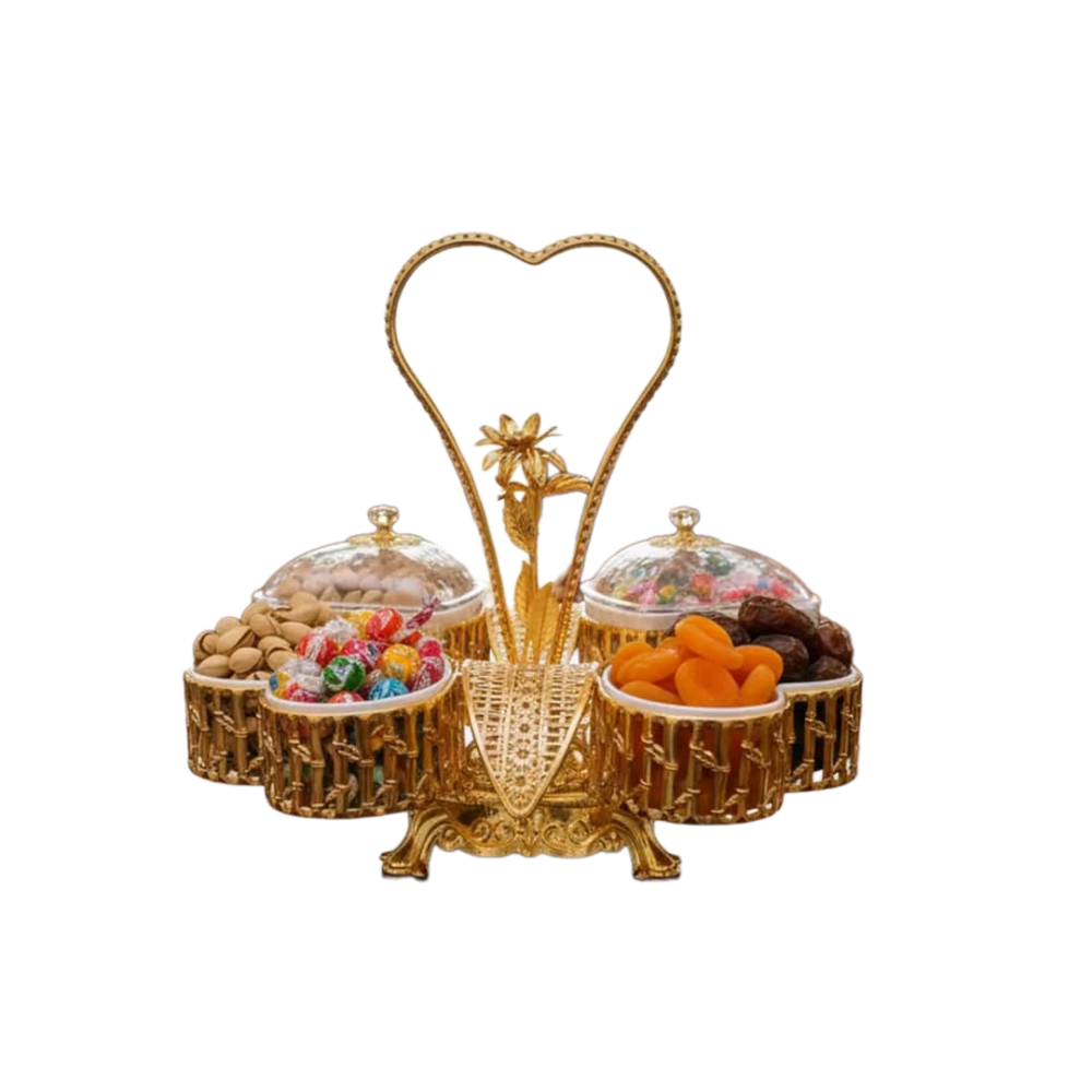 سعة تقديم كبيرة: يحتوي على ستة أقسام منفصلة تتيح تقديم أنواع متعددة من الضيافة في وقت واحد. هيكل معدني مترابط: إطار ذهبي قوي يجمع الأوعية بشكل آمن ومنظم لمنع تبعثرها. أوعية قابلة للتغطية: مزود بأغطية شفافة تحمي المحتويات من الأتربة وتحافظ على طزاجتها لفترة أطول. |