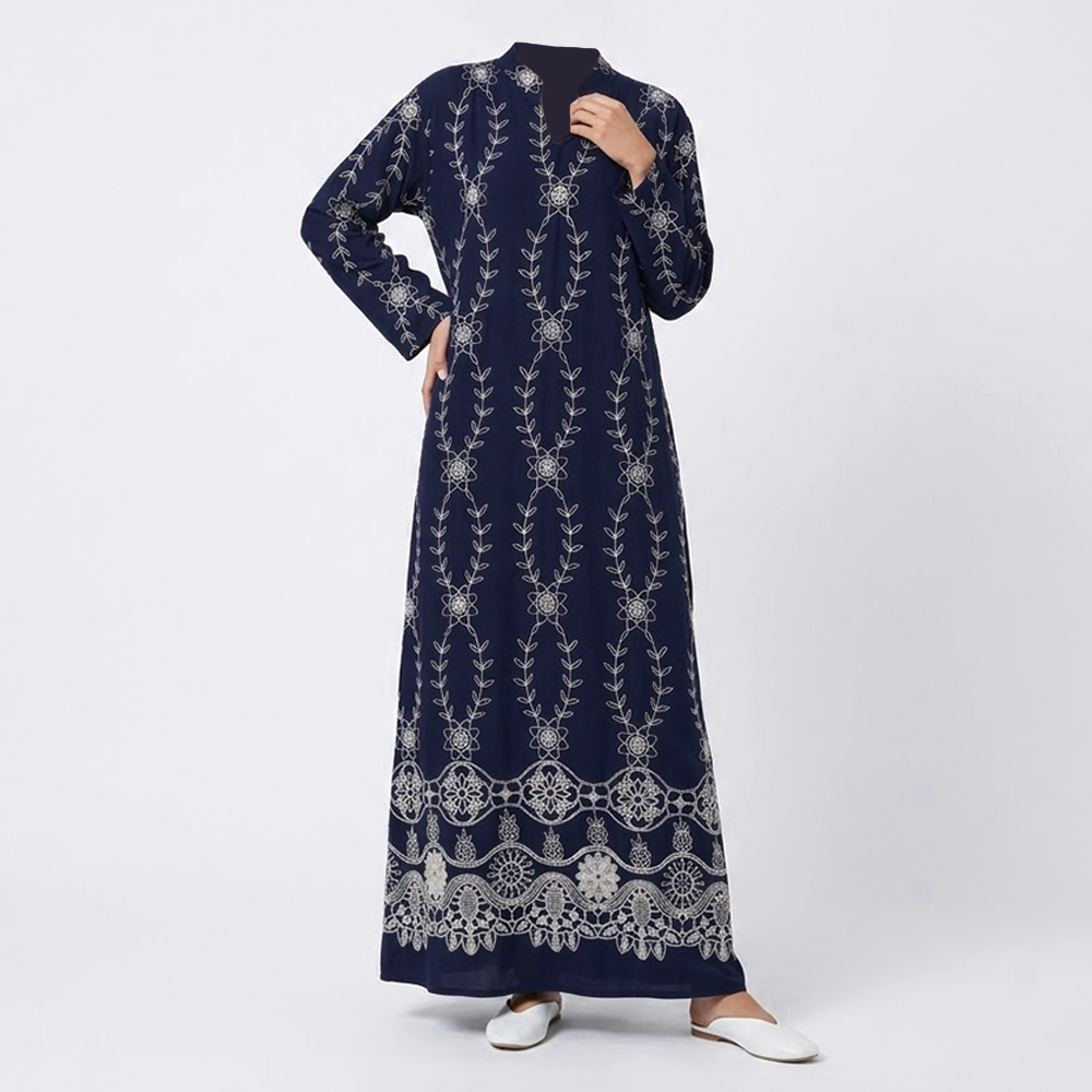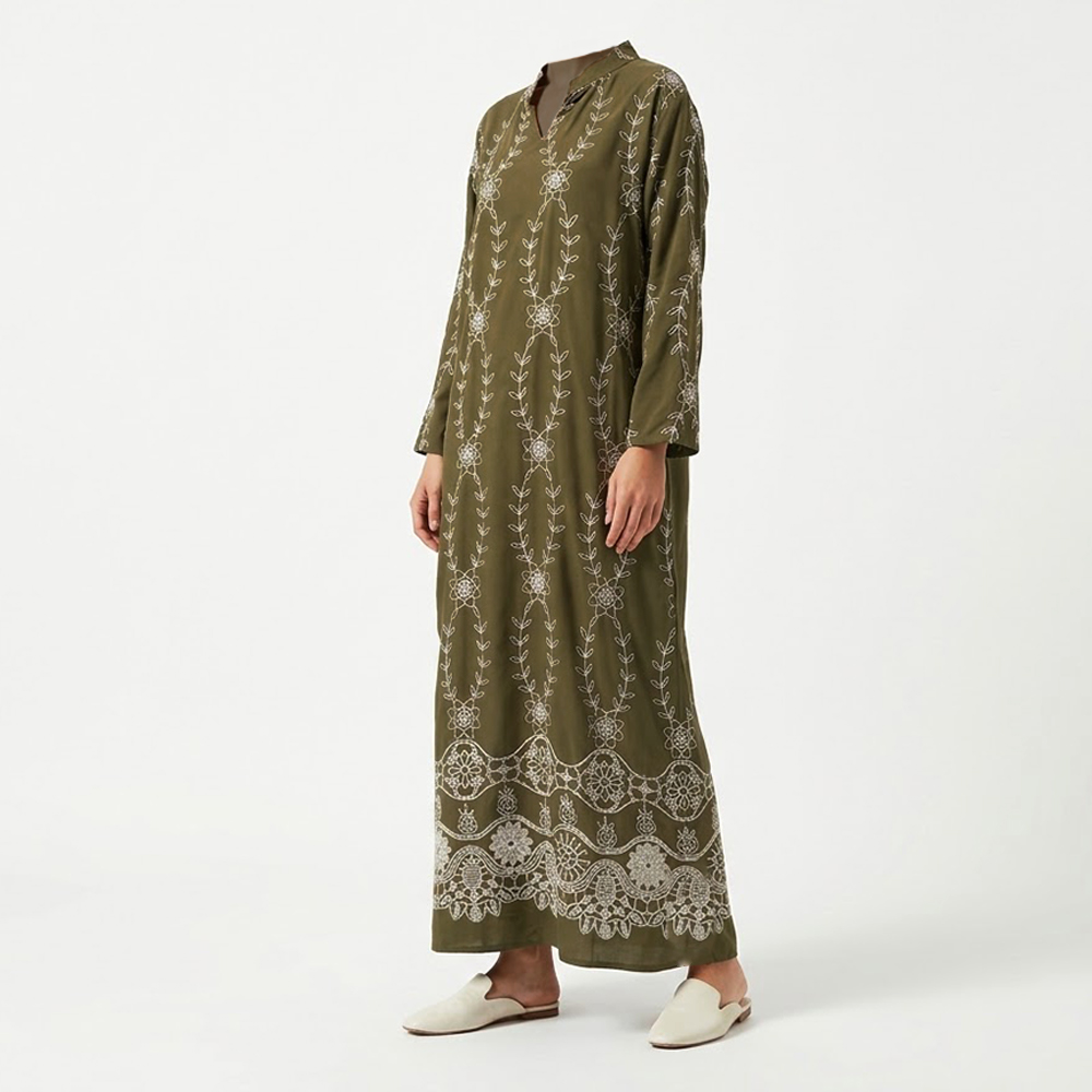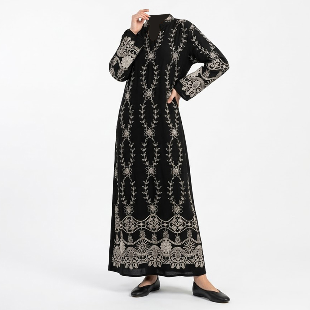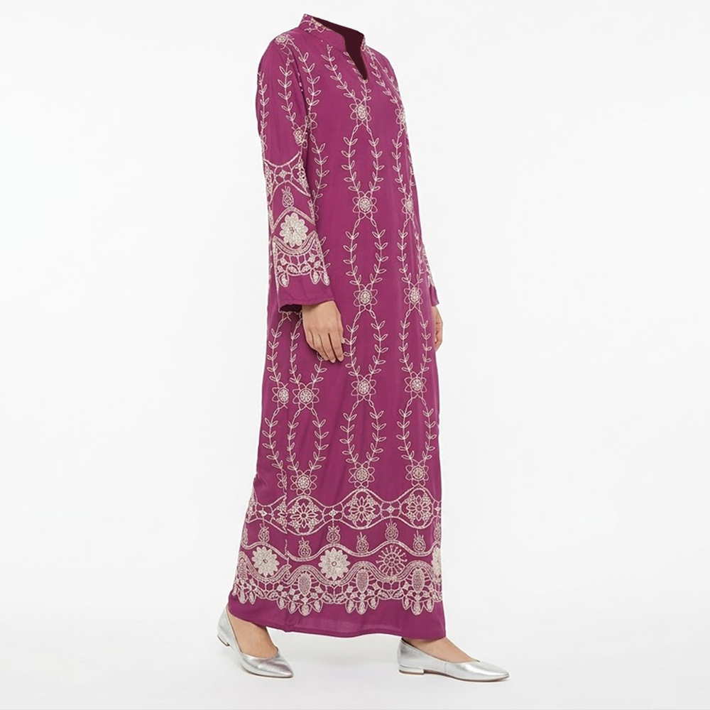 جلابية أنيقة مزينة بتطريزات ناعمة ممتدة على كامل التصميم، تعطيها مظهراً راقياً ومميزاً. تتميز بقصة مريحة وأكمام طويلة مناسبة للارتداء اليومي أو المناسبات البسيطة.
