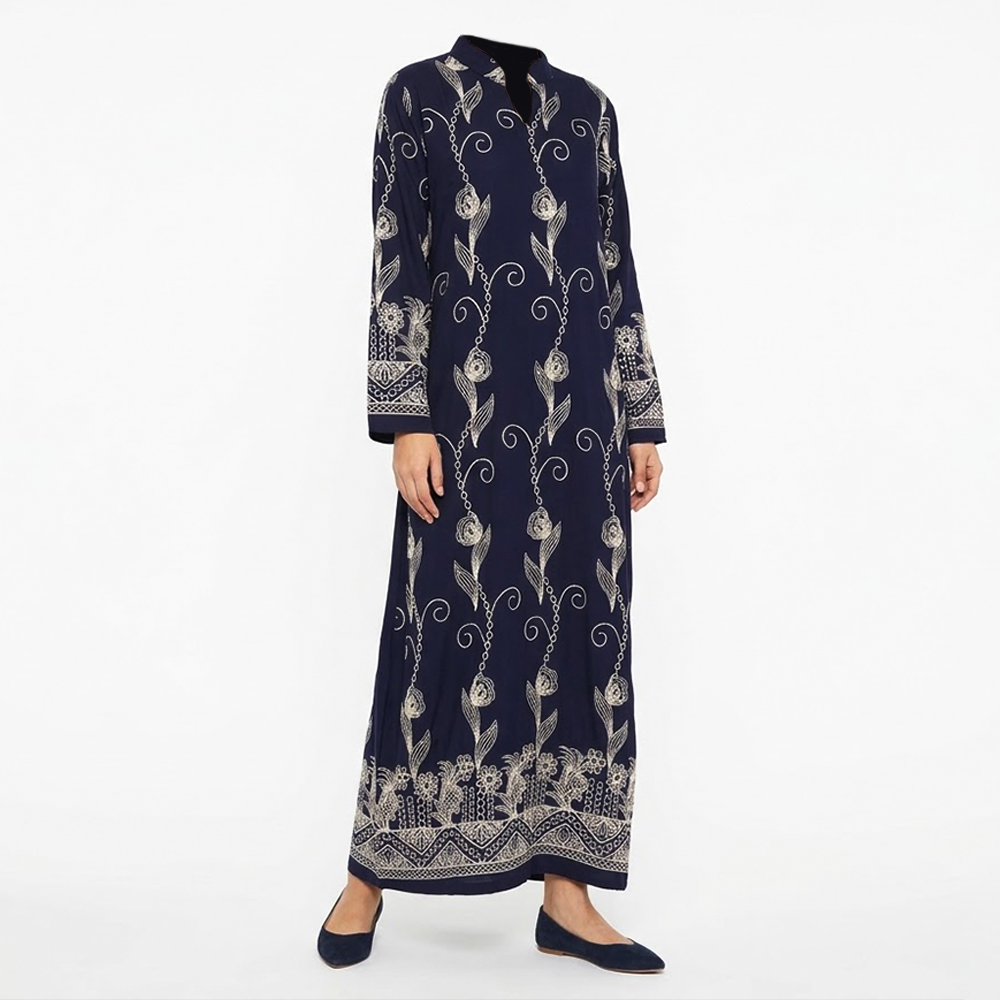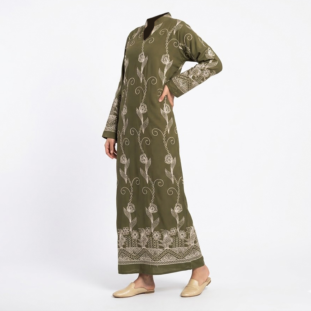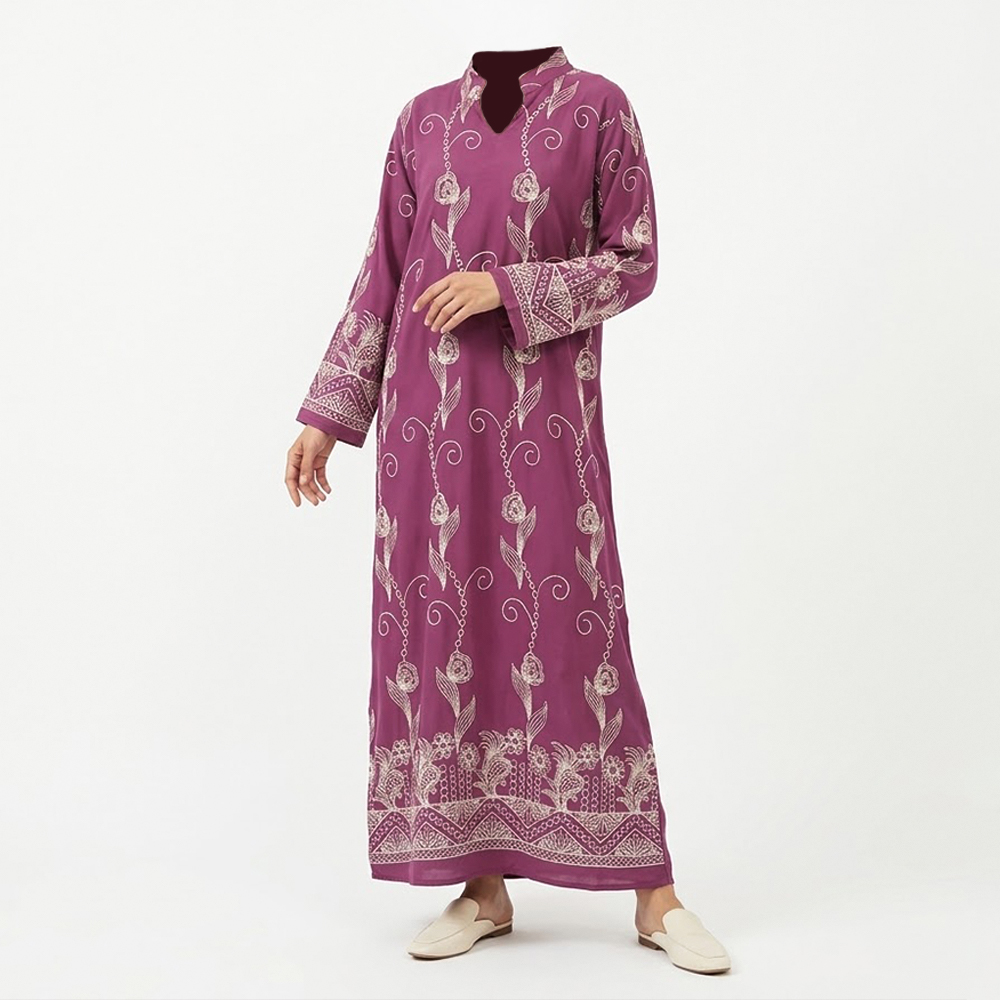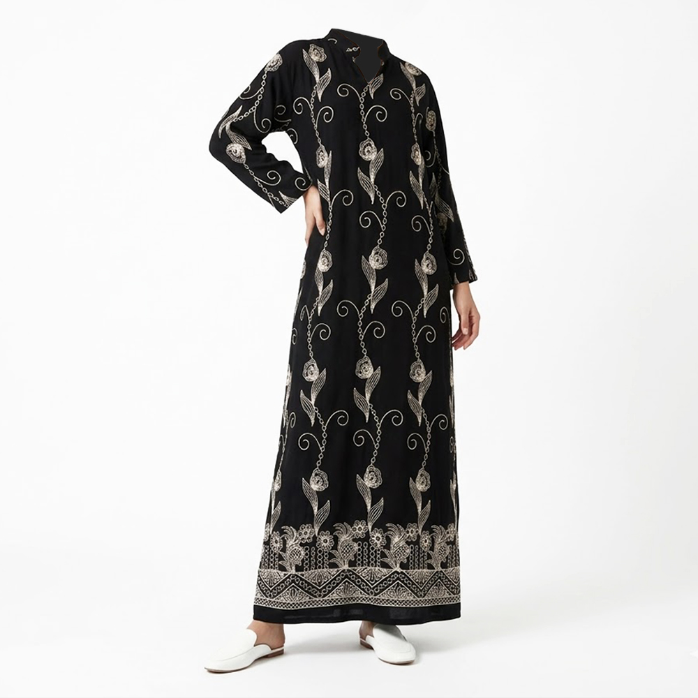 جلابية نسائية طويلة بتصميم أنيق مزينة بنقوش ناعمة بلون فاتح تضيف لمسة فخامة. مناسبة للارتداء اليومي والمناسبات البسيطة، بقصة مريحة وأكمام طويلة تمنحك إطلالة راقية ومحتشمة.