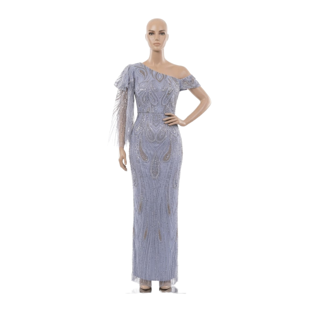 فستان سهرة ناعم بكتف واحد، مطرز بالكامل بالخرز اللامع مع لمسة ريش فخمة على الكتف، يتميز بقصة طويلة وأنيقة تمنحك إطلالة ملكية في المناسبات.