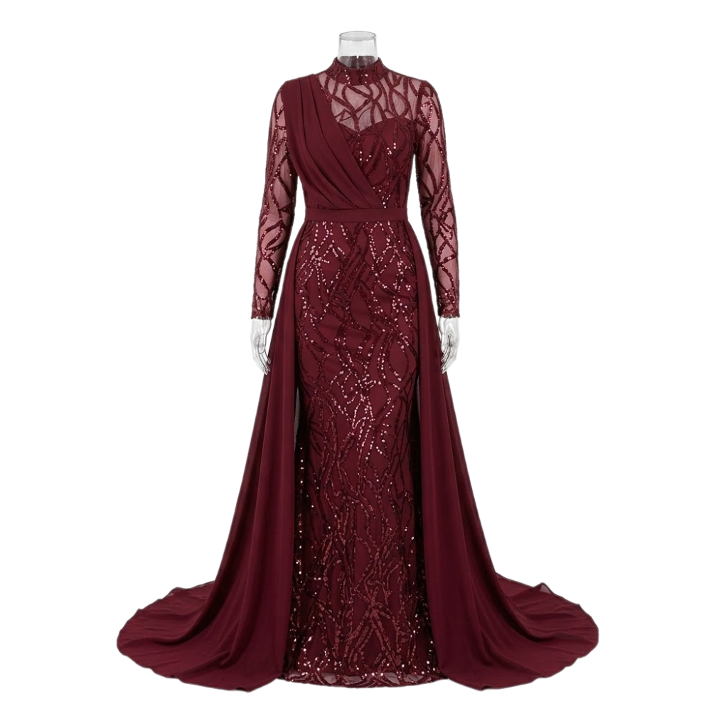 فستان كلاسيكي فاخر بأكمام طويلة وتطريزات براقة، يتميز بذيل منسدل يمنحكِ إطلالة ملكية عصرية وجذابة.