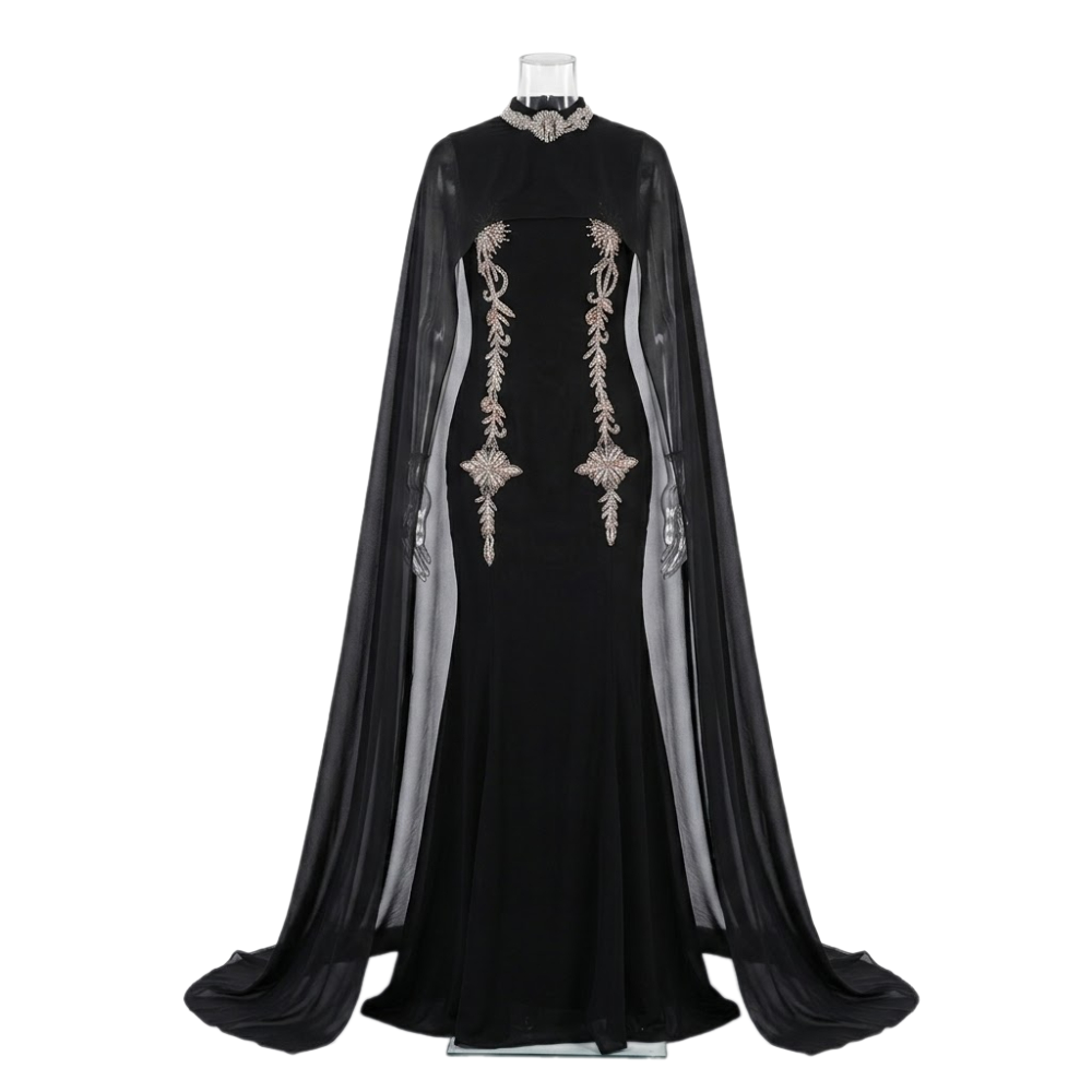 فستان كاب الملكي يجمع بين التطريز الفاخر والوشاح المنسدل ليمنحكِ إطلالة أرستقراطية مهيبة تخطف الأنظار.