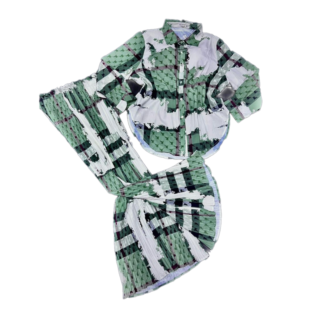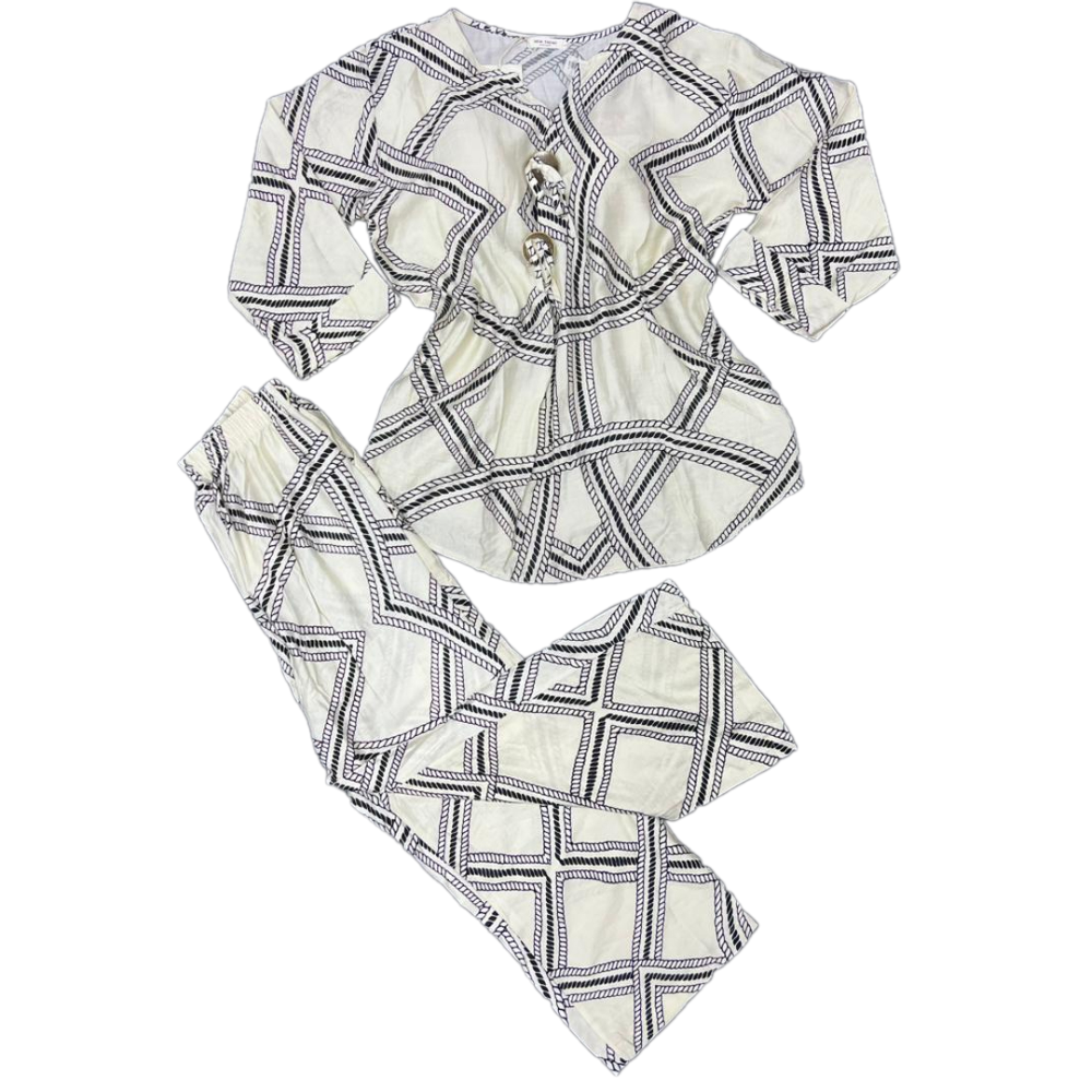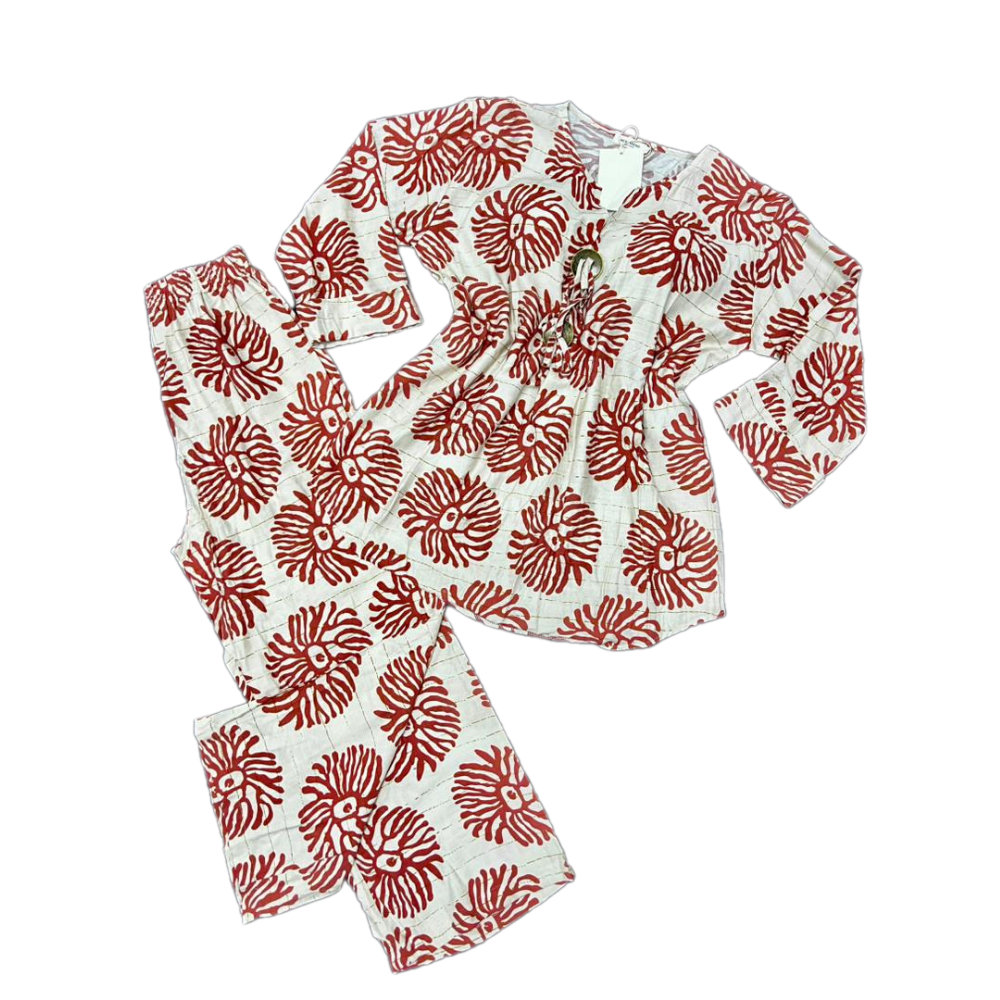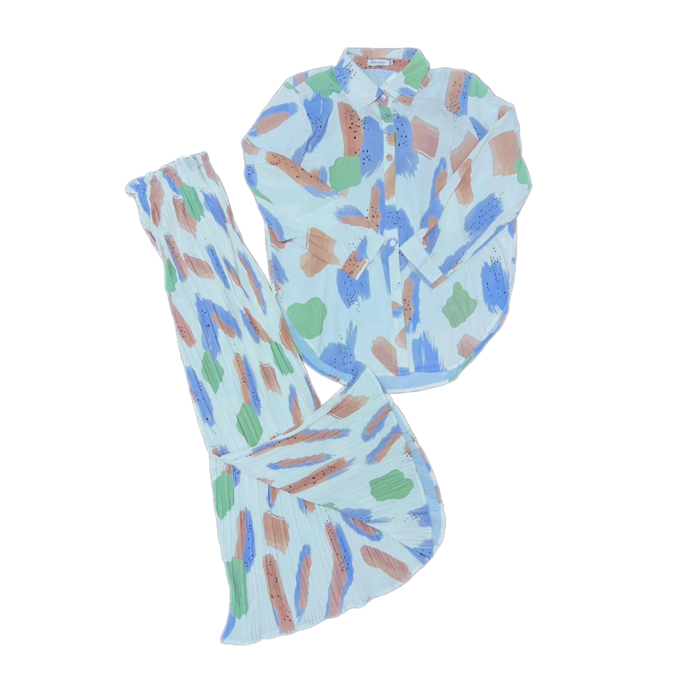 طقم قطعتين بنقوش حيوية وقصة واسعة مريحة تجمع بين الأناقة والعملية للاستخدام اليومي.