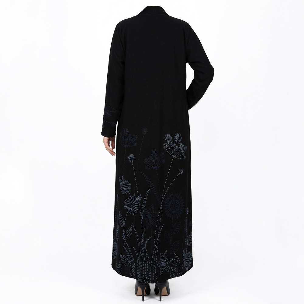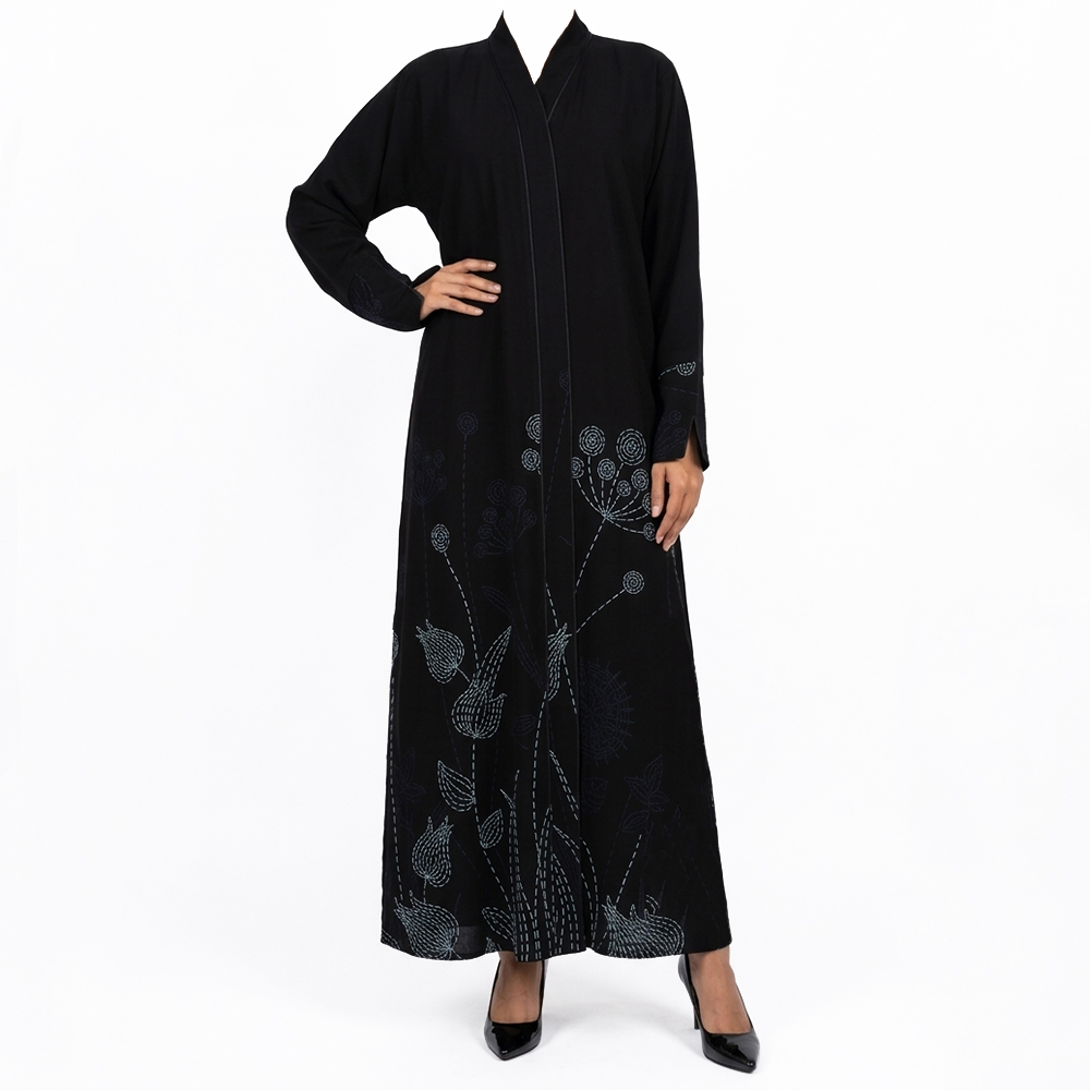 عباية سوداء أنيقة بتصميم عصري مميز، مزينة بتطريزات فنية ناعمة تضيف لمسة جمالية راقية، لتمنحك إطلالة جذابة تجمع بين البساطة والتفرد