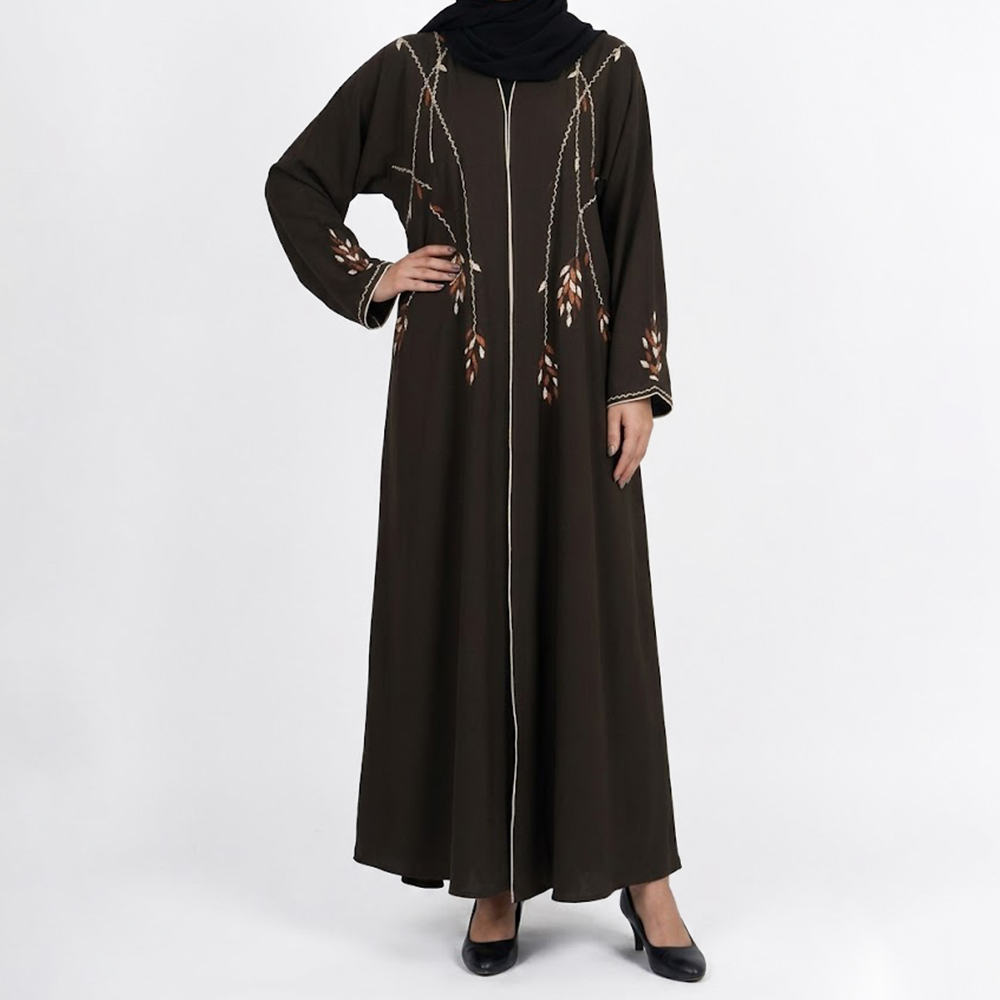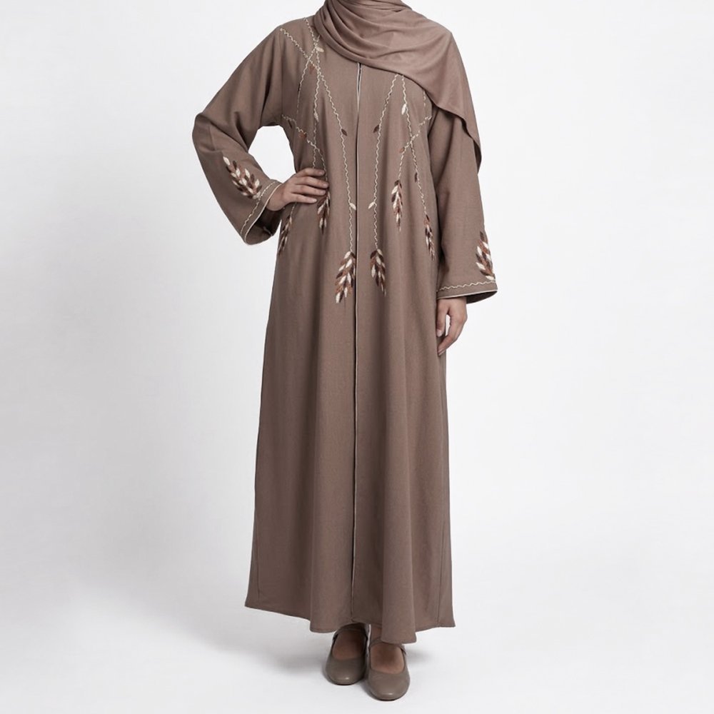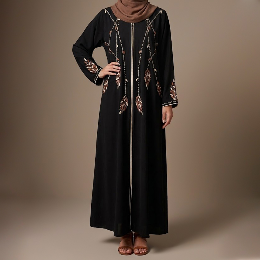 عباية أنيقة بتصميم بسيط وراقي، مزينة بتطريز على شكل أوراق متدلية يمنحها لمسة طبيعية جذابة. تتميز بقصة مريحة وانسيابية مع سحاب أمامي عملي، لتكون خيارًا مثاليًا لإطلالة يومية أنيقة وعصرية.
