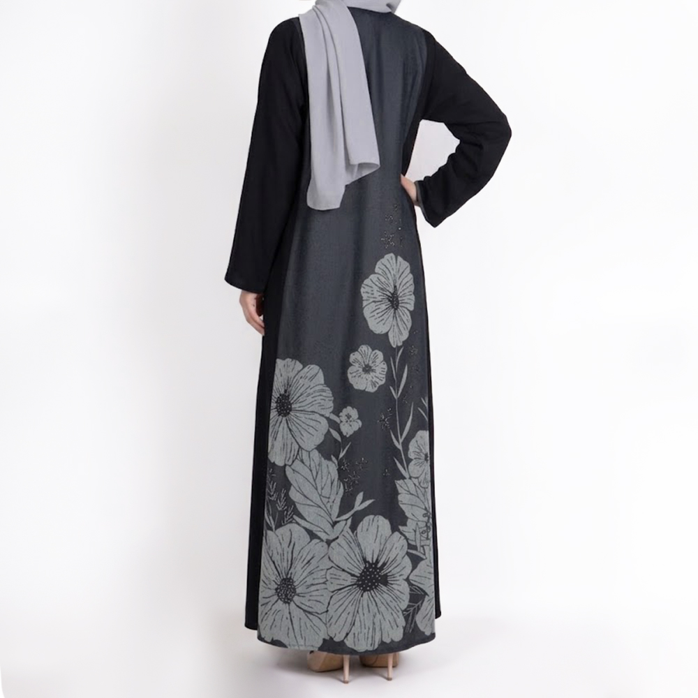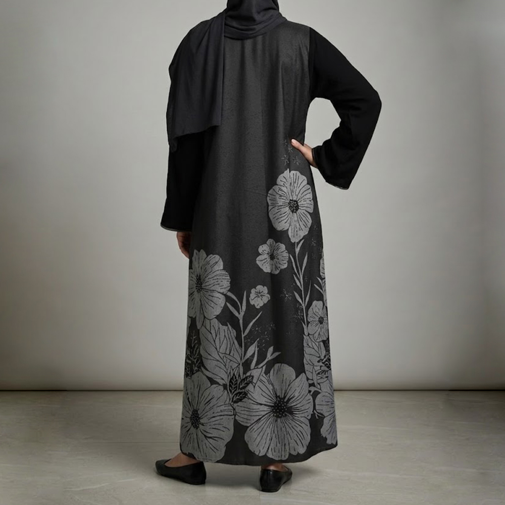 عباية نسائية أنيقة مزينة بنقشة زهور كبيرة على الجزء الخلفي تضيف لمسة فنية وجذابة للتصميم. تتميز بقصتها الواسعة المريحة التي تمنح إطلالة أنيقة ومحتشمة، مما يجعلها مناسبة للاستخدام اليومي والخروج.