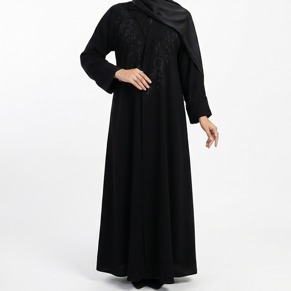 عباية نسائية بتصميم راقٍ وانسيابي، مزينة بتطريز ناعم وهادئ على الجهة الأمامية يمنحها لمسة فخامة بدون مبالغة. قصتها الواسعة توفر راحة مثالية مع مظهر أنيق يناسب مختلف الإطلالات.