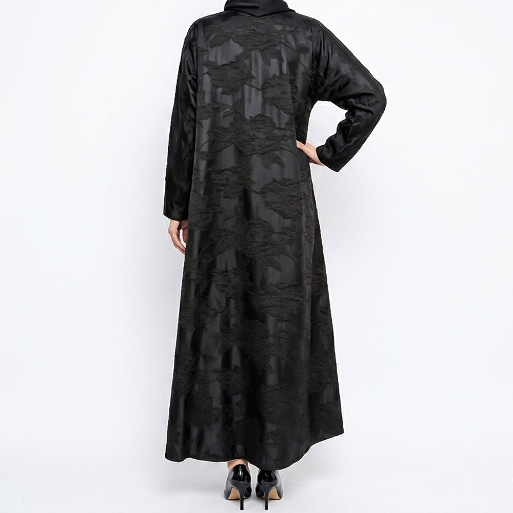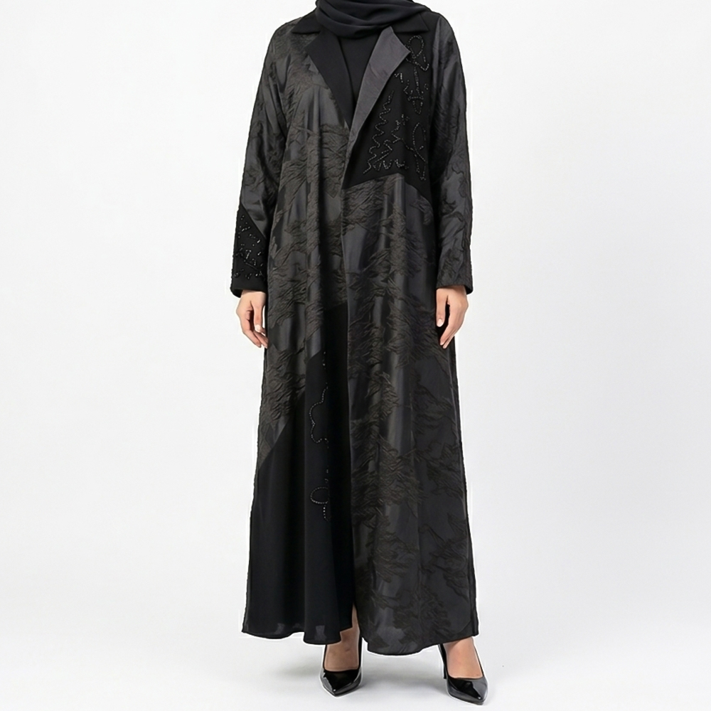 عباية سوداء أنيقة بتصميم عصري فاخر، تتميز بقماش لامع بنقوش ناعمة وياقة رسمية تضيف لمسة راقية، مثالية لإطلالة أنثوية مميزة تجمع بين الفخامة والبساطة.