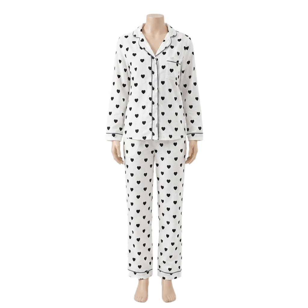 طقم بيجاما كلاسيكي من قطعتين بنقشة القلوب وأزرار أمامية، يجمع بين الأناقة والراحة المثالية للنوم.