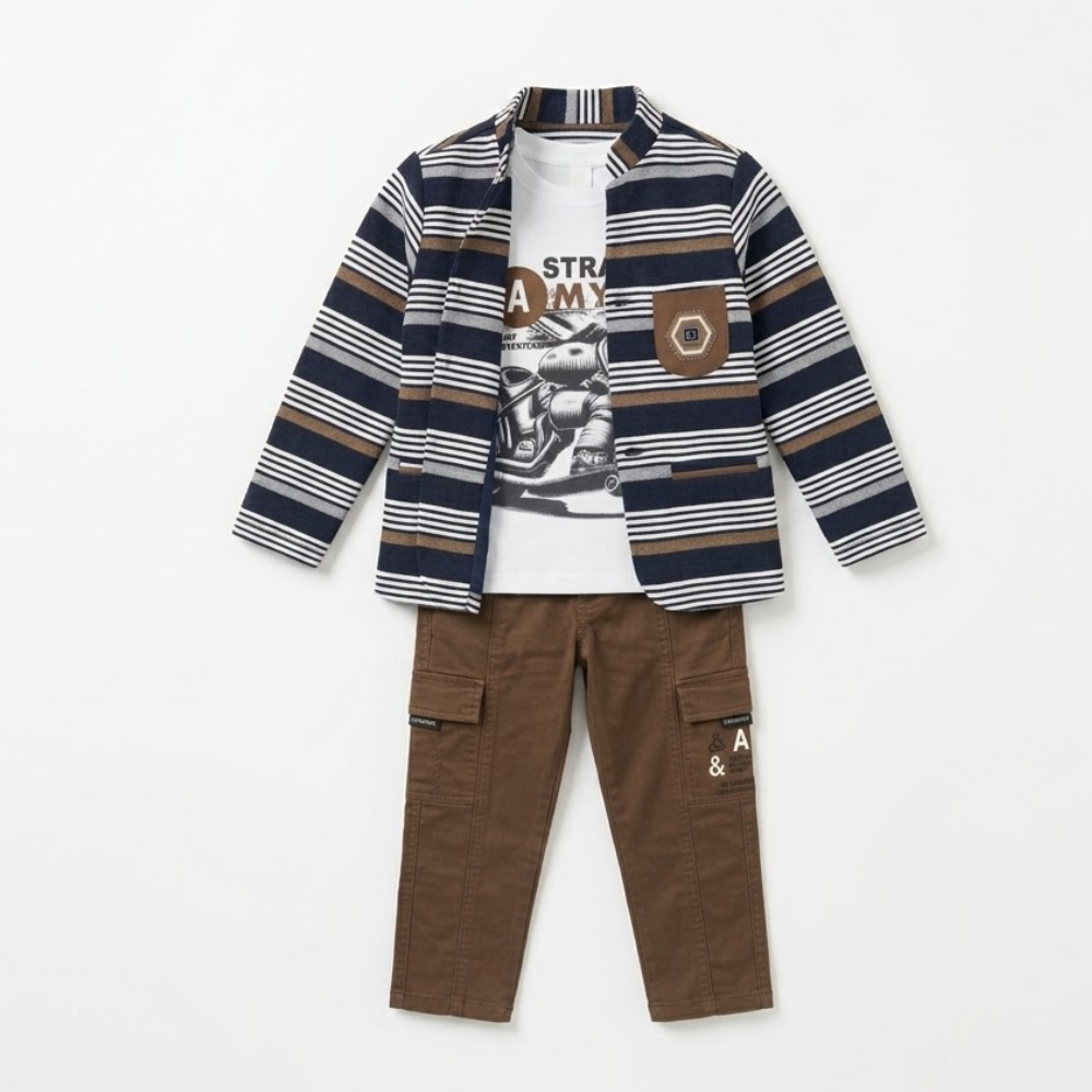 يتكون الطقم من 3 قطع ويأتي الجاكيت بتصميم مخطط عرضي أنيق والبنطال باللون البني مصمم بجيوب جانبية عملية وشريط مطاطي |