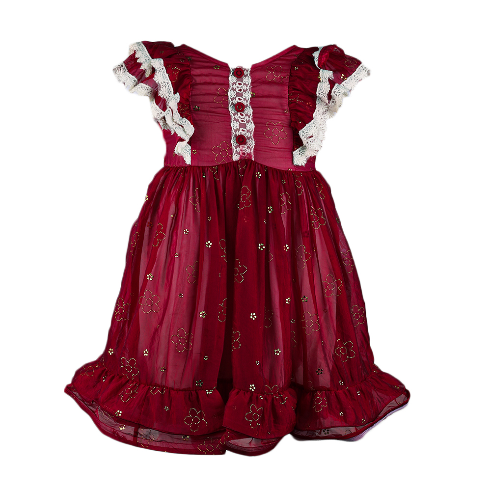 فستان بناتي مبطن بقماش منقوش بأشكال ورد ، مزين بكشاكش على الأكتاف مٌحاطة من الأطراف بالدانتيل ، بأزرار في منتصف الصدر ، بقصة تنورة واسعة .